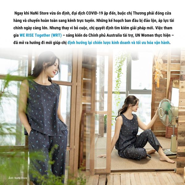 Dù mang nhiều giá trị nhân văn, NaNi Store vẫn đối diện với những thách thức lớn. Khi đại dịch ập đến, các cửa hàng buộc phải đóng cửa, doanh thu sụt giảm và mô hình kinh doanh truyền thống bị đảo lộn. Việc tìm ra hướng đi mới trở thành một bài toán cấp bách. Chị Thương quyết định tham gia WE RISE Together (WRT), sáng kiến do Chính phủ Australia tài trợ, UN Women thực hiện, với hy vọng sẽ giúp NaNi Store tiếp túc phát triển sau khủng hoảng. WRT đã hỗ trợ NaNi: