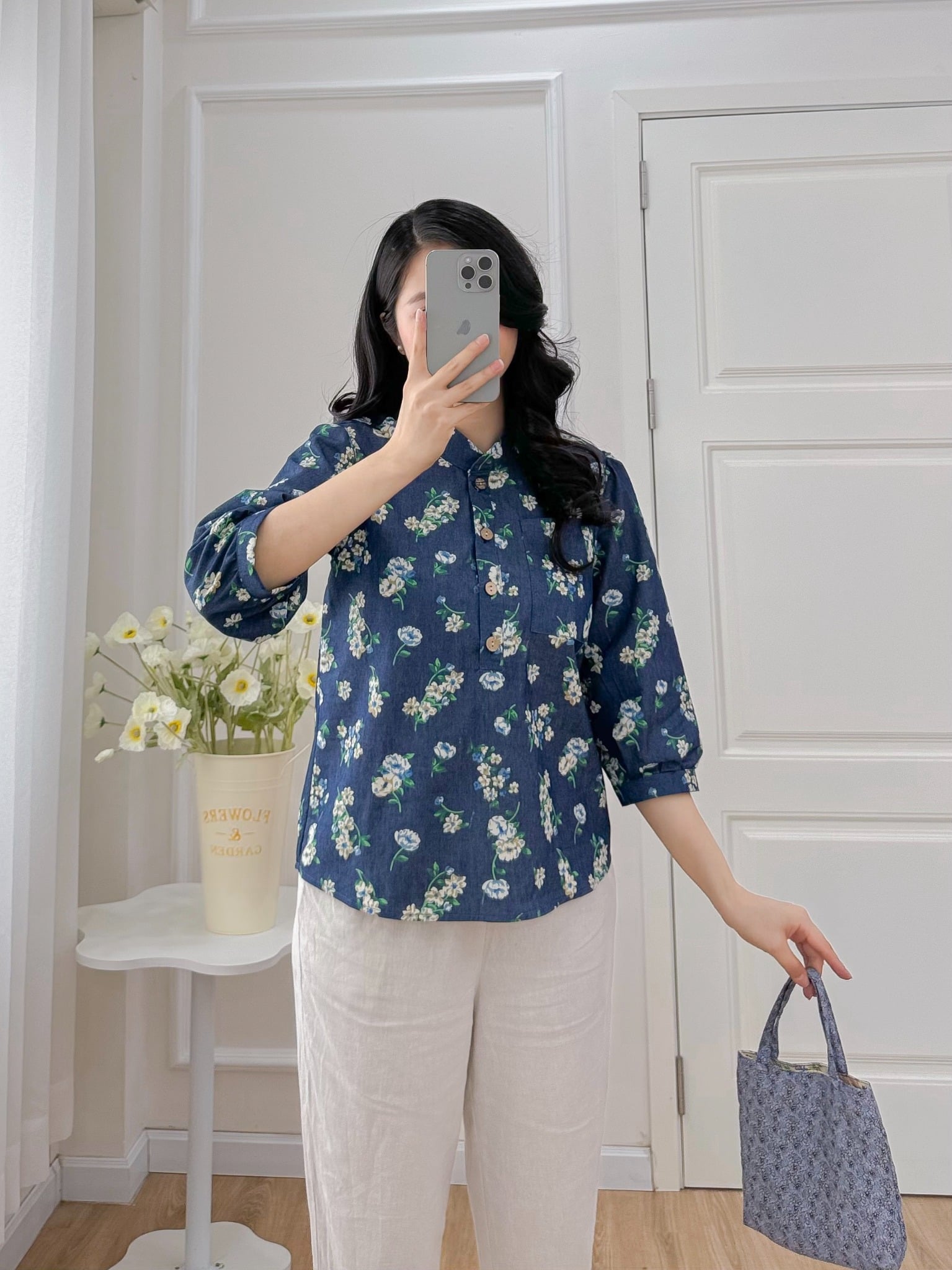 Áo sơ mi cổ tàu hoạ tiết hoa cúc dược NaNi Store là thiết kế độc quyền, form dáng chuẩn, không đụng hàng. Áo sơ mi thiết kế cổ trụ, tiện lợi 2 trong 1, vừa mặc nhà, vừa dạo phố, đi tiệc, các buổi họp. Vải denim, ít nhăn, thích hợp cho các chị ngại ủi. Phom giấu bụng rất tốt, vải mặc nhà không cần mặc áo bra. Đủ size từ 43-75kg