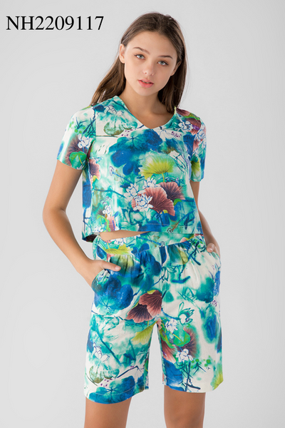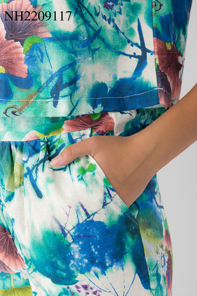 2. Mô tả chi tiết Bộ đồ đùi có tay linen hoa xanh: