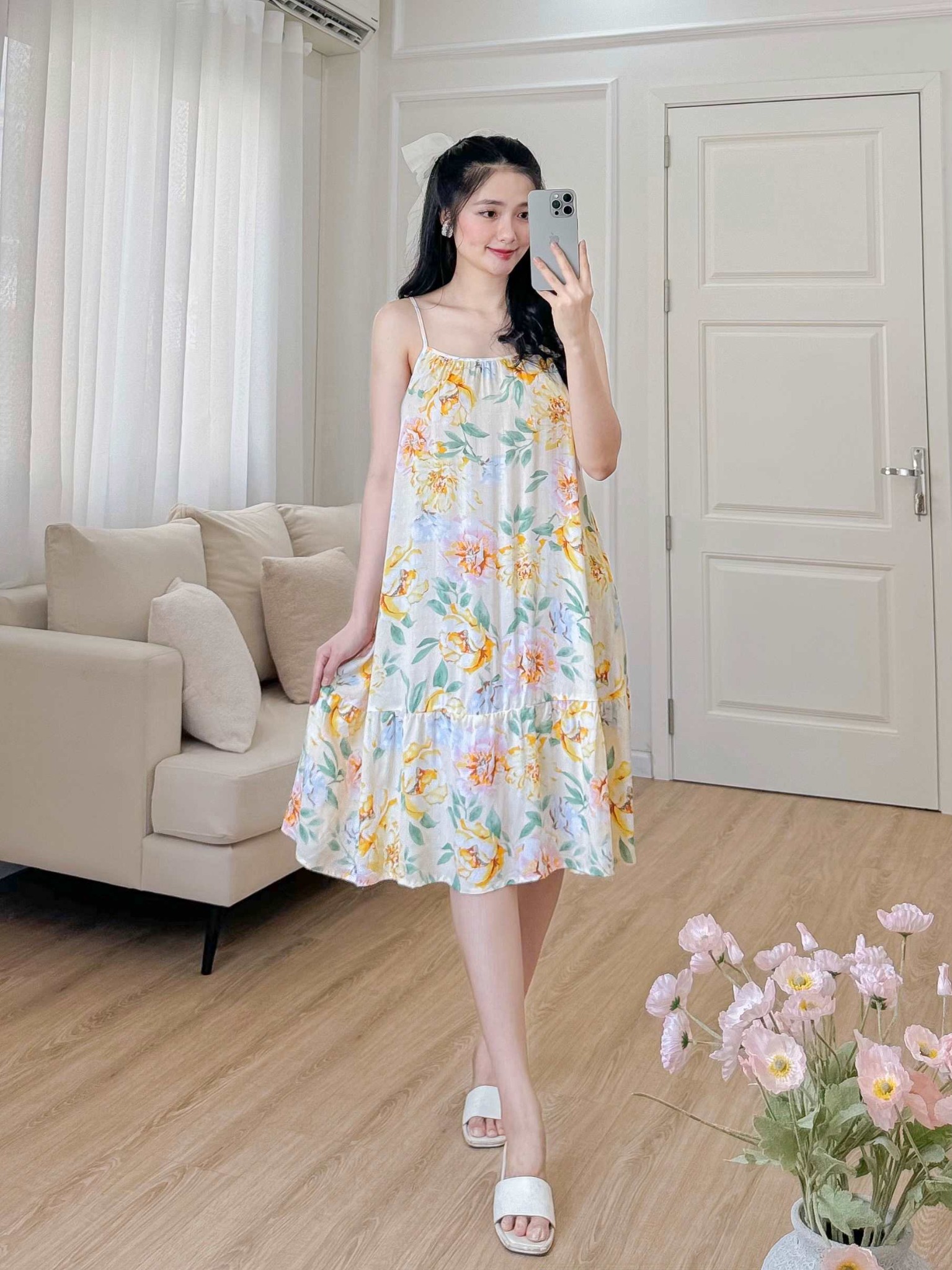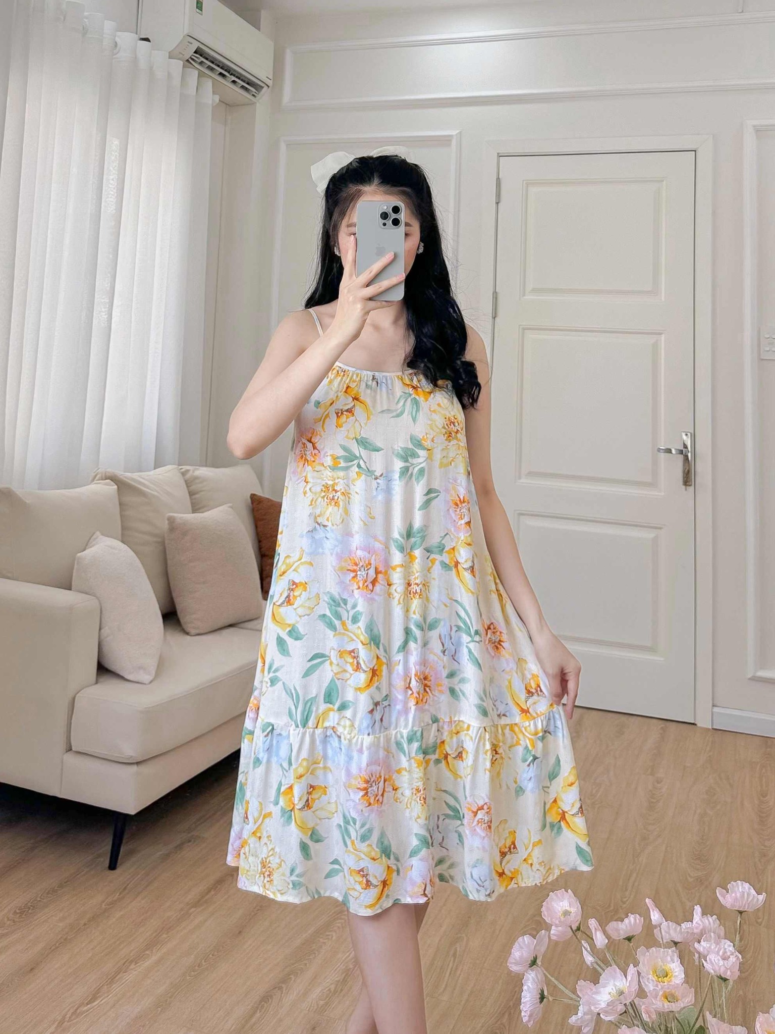 Đầm lụa 2 dây nền vàng hoa mẫu đơn NaNi Store là thiết kế độc quyền, form dáng chuẩn, không đụng hàng. Đầm lụa cotton thiết kế dáng suông tiện lợi 2 trong 1, vừa mặc nhà, vừa dạo phố. Vải lụa cotton mềm, phom giấu bụng rất tốt. Đủ size từ 43-75kg