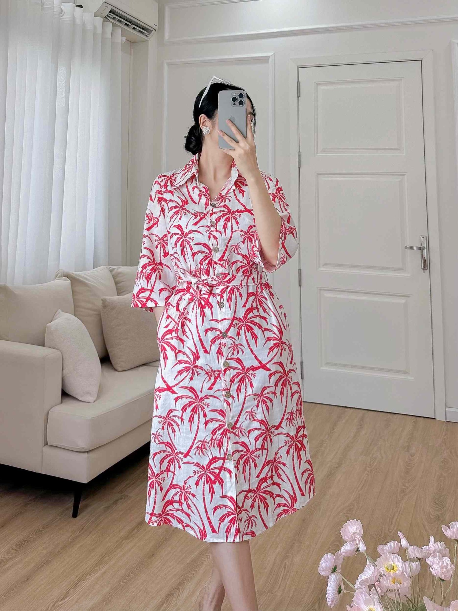 1. Đặc điểm nổi bật Đầm sơ mi tay lỡ linen họa tiết dừa đỏ