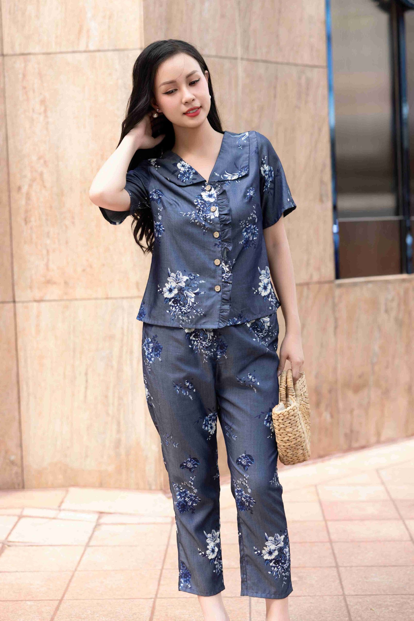 Đồ bộ dài có tay cổ vạn hoa hoạ tiết hoa ly NaNi Store là thiết kế độc quyền, form dáng chuẩn, không đụng hàng. Đồ bộ mặc nhà thiết kế tiện lợi 2 trong 1, vừa mặc nhà, vừa dạo phố. Vải denim, ít nhăn, thích hợp cho các chị ngại ủi. Phom giấu bụng rất tốt, vải mặc nhà không cần mặc áo bra. Đủ size từ 43-75kg