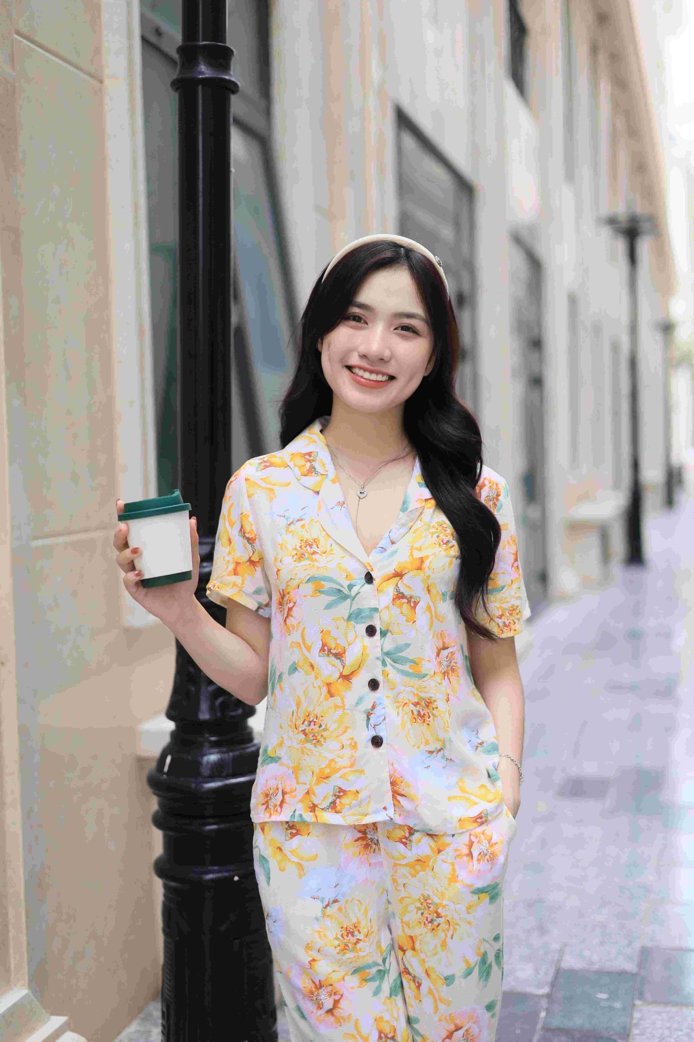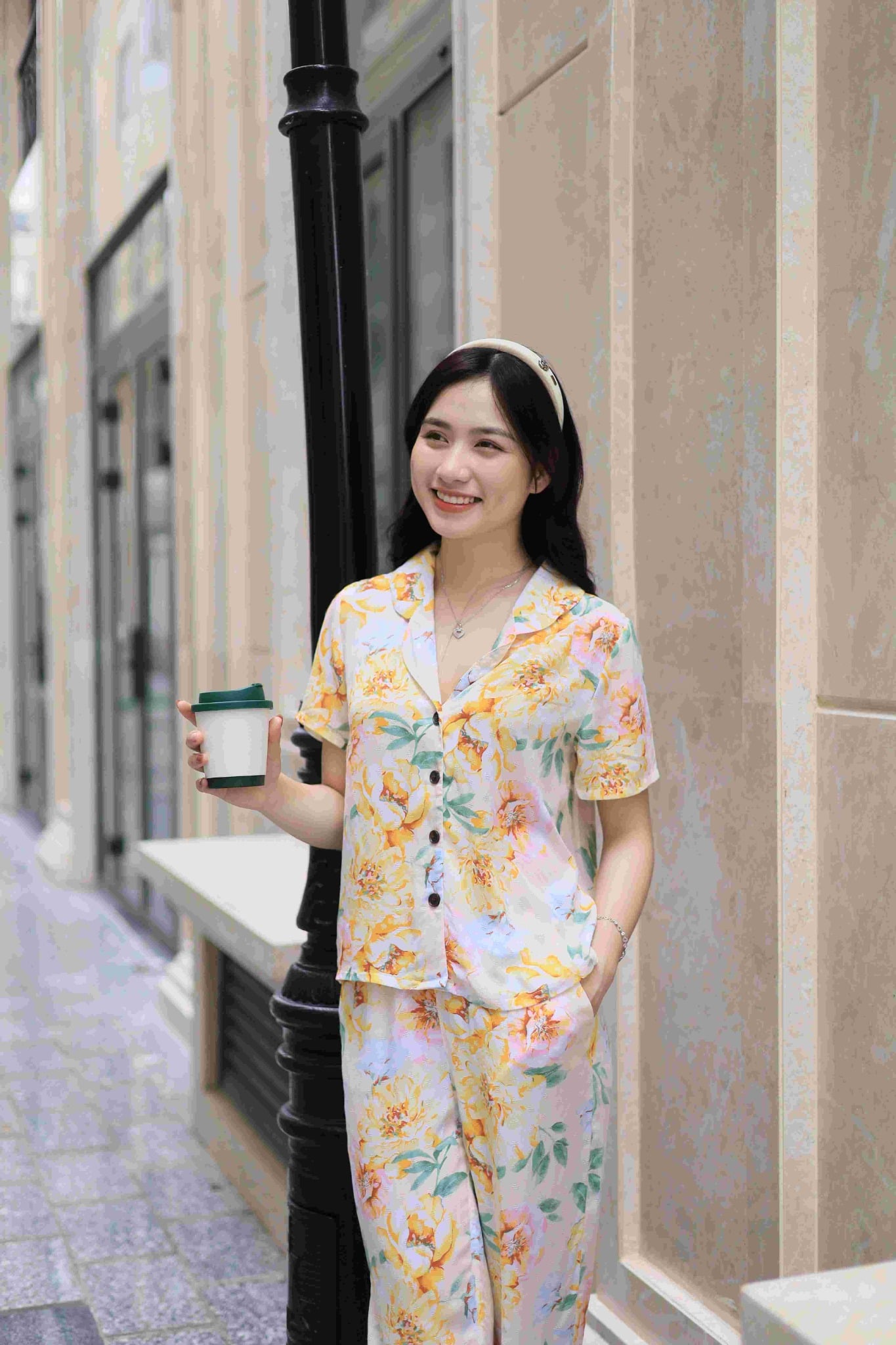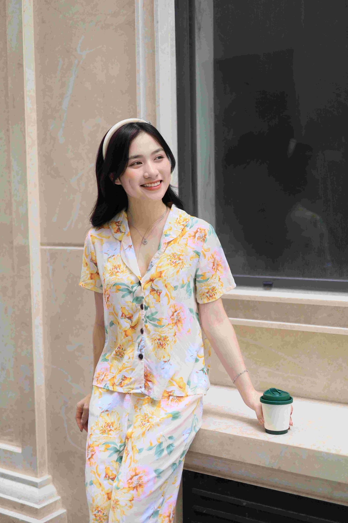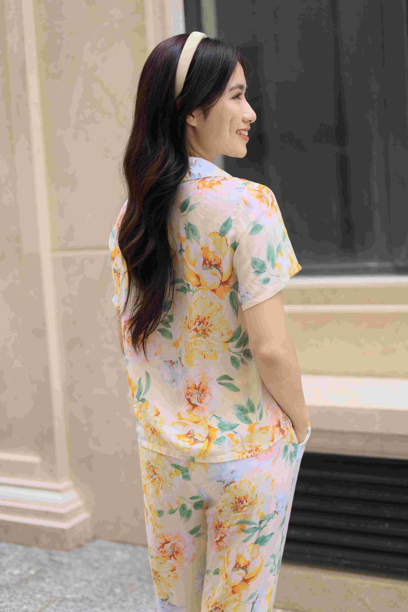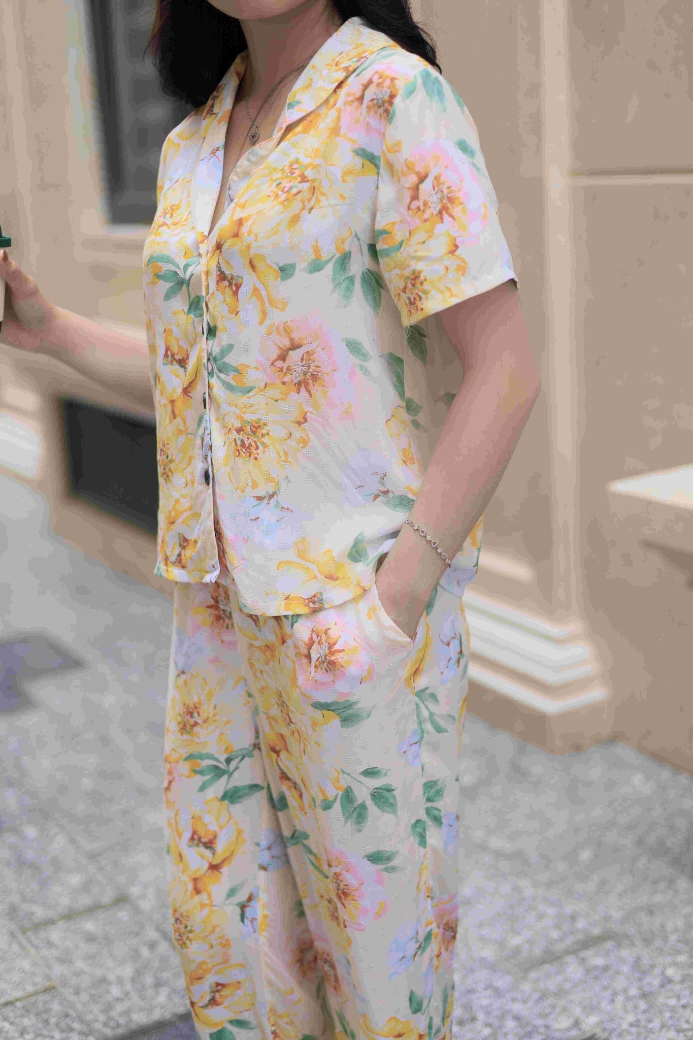2. Mô tả chi tiết Đồ bộ dài có tay nền vàng hoa mẫu đơn