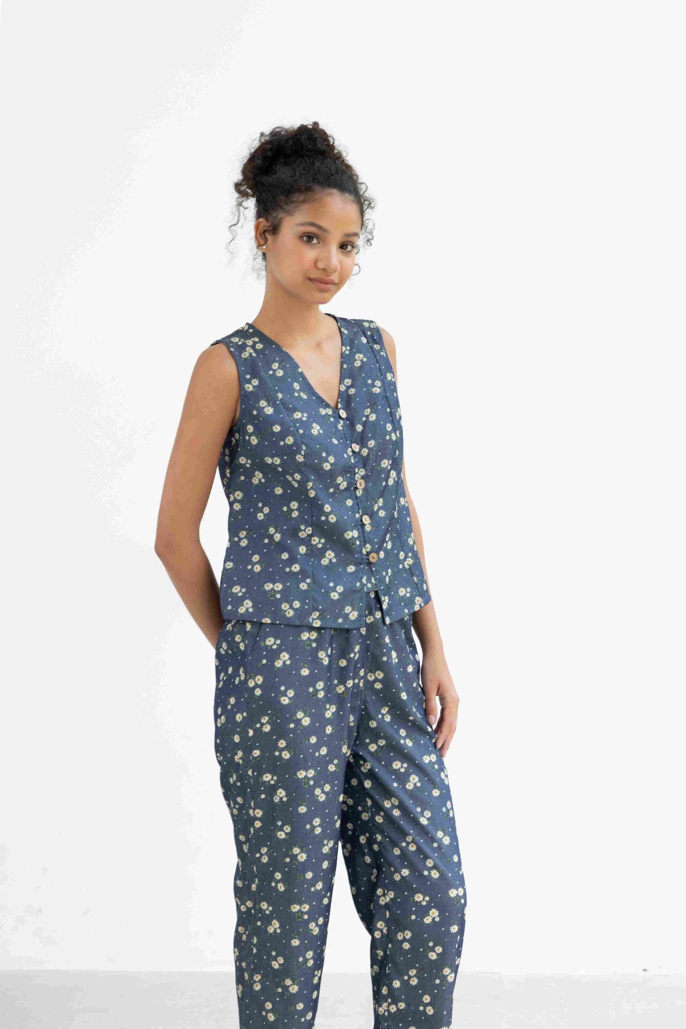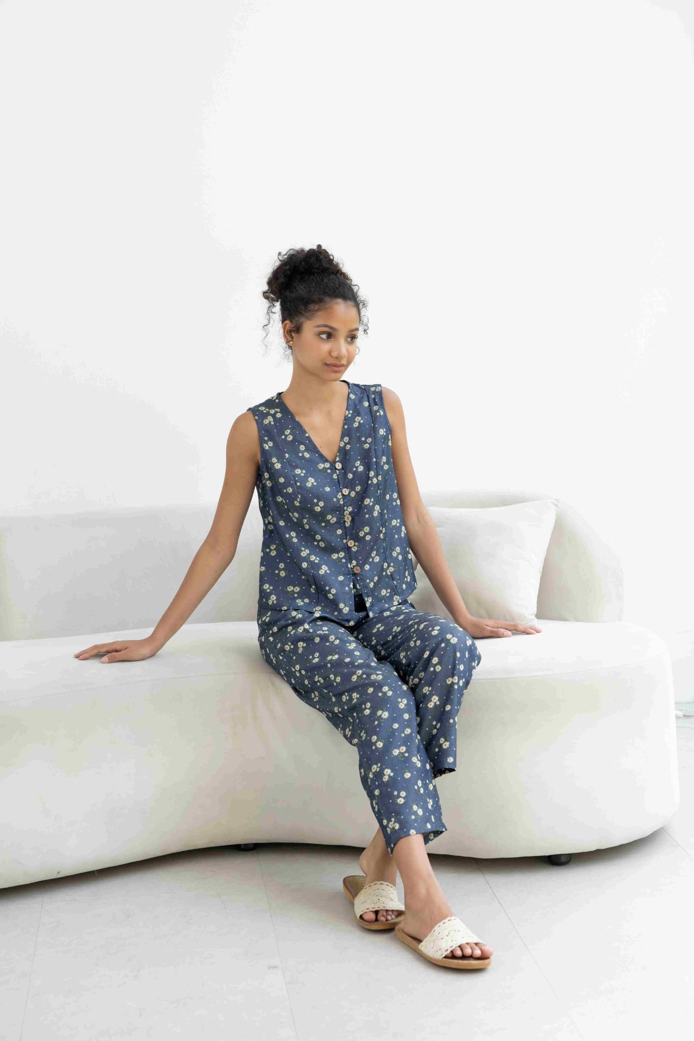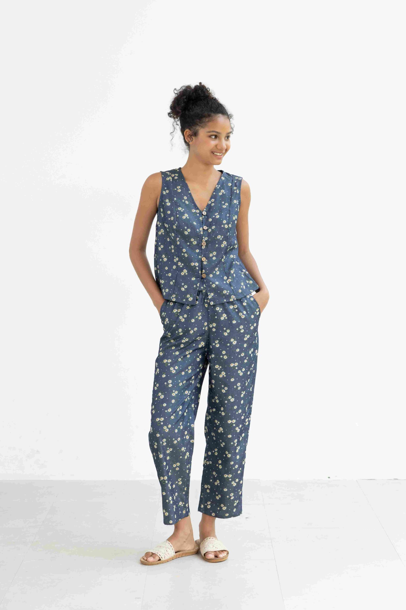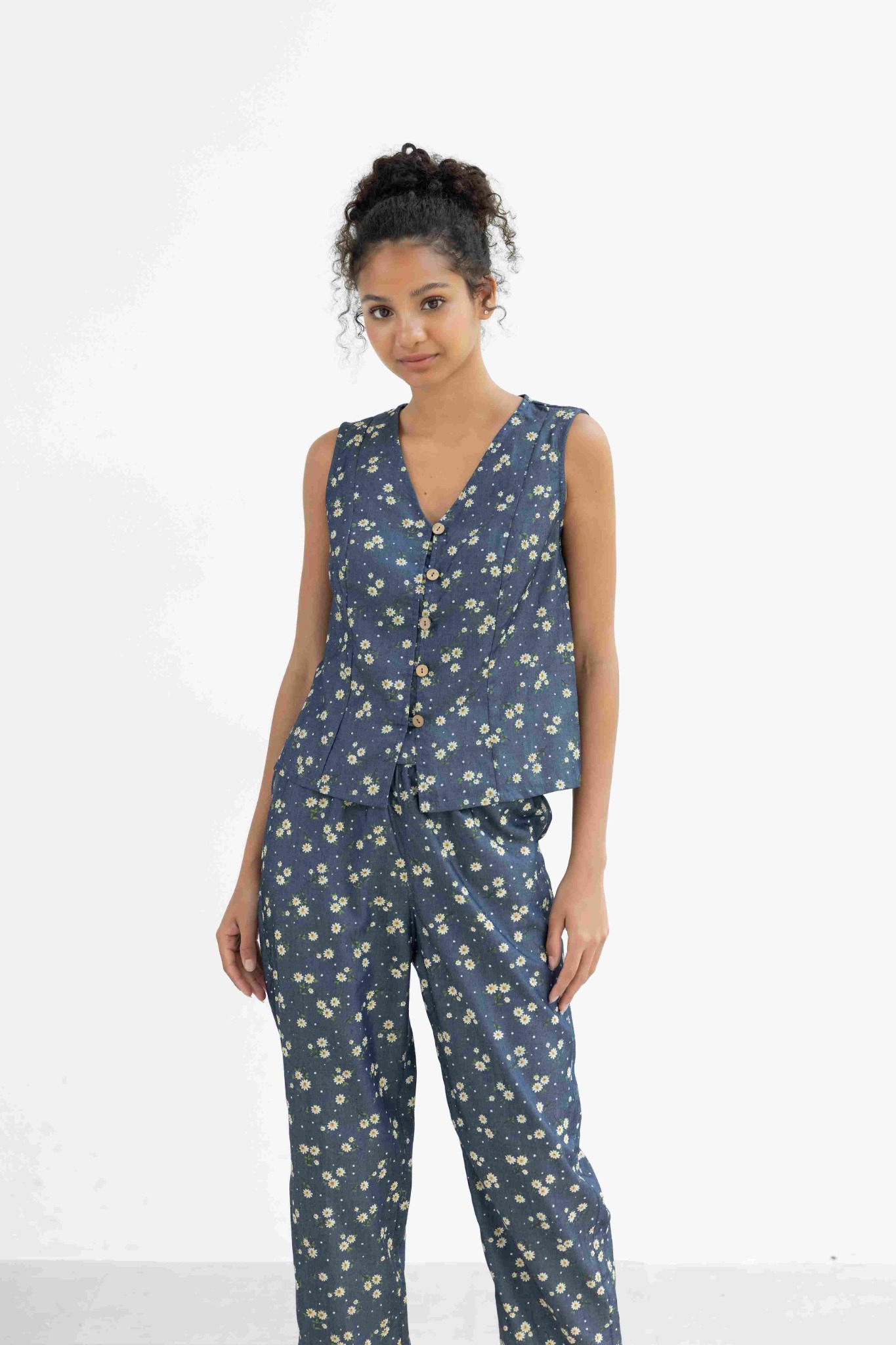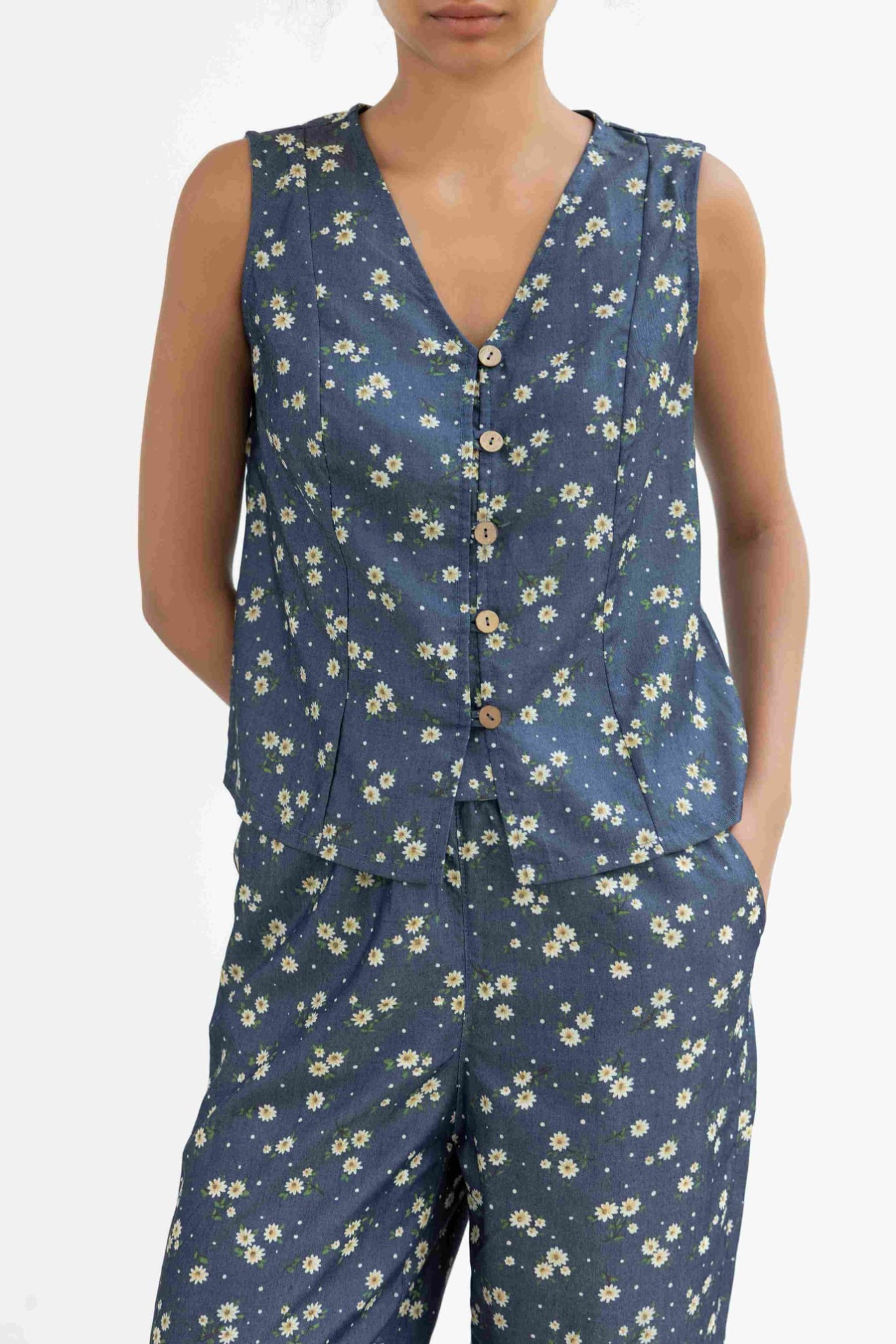 Đồ bộ dài không tay nút gỗ hoa cúc tana NaNi Store là thiết kế độc quyền, form dáng chuẩn, không đụng hàng. Đồ bộ mặc nhà thiết kế tiện lợi 2 trong 1, vừa mặc nhà, vừa dạo phố. Vải cotton giả jean giặt máy thoải mái, ít nhăn, thích hợp cho các chị ngại ủi. Phom giấu bụng rất tốt, vải mặc nhà không cần mặc áo bra. Đủ size từ 43-75kg
