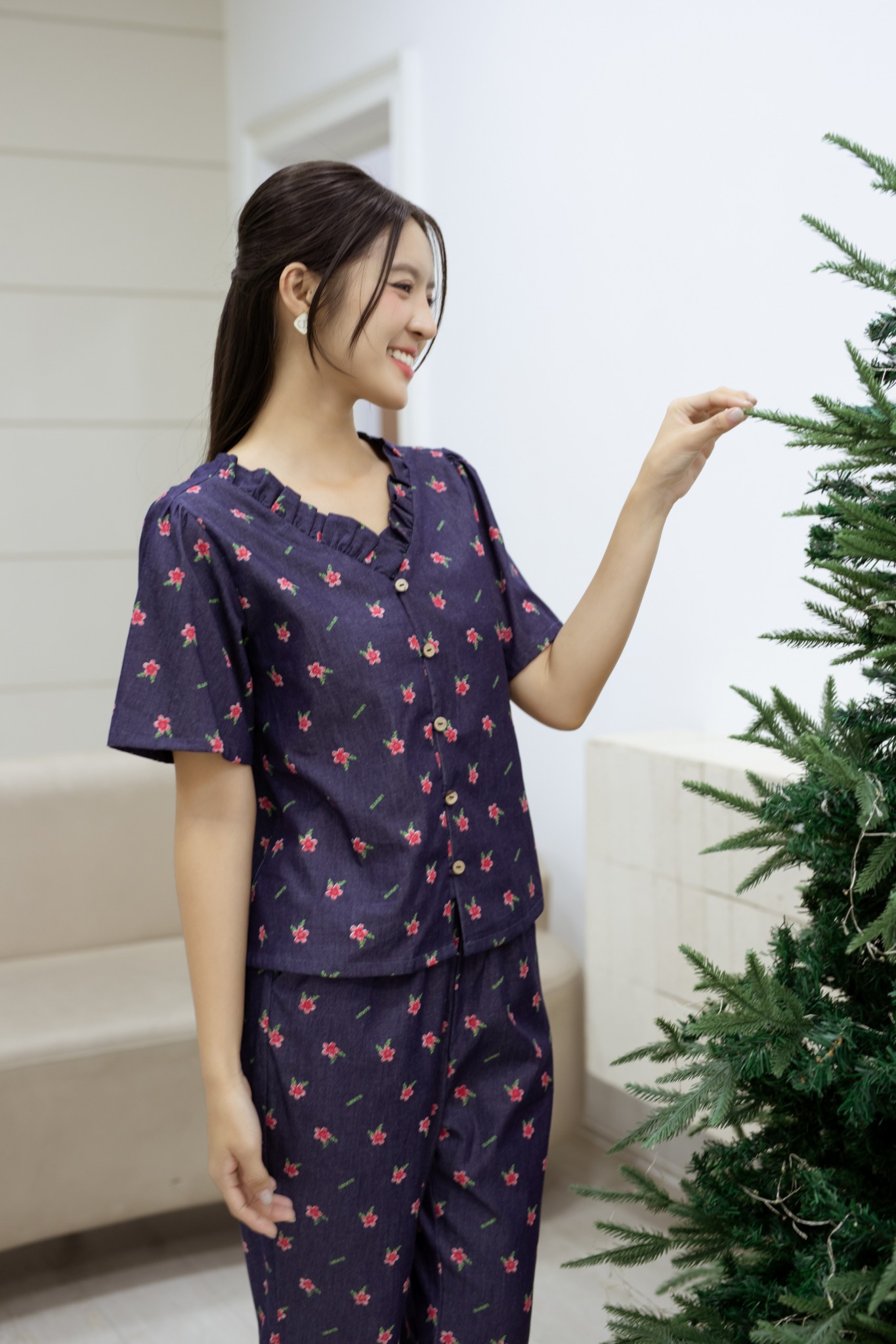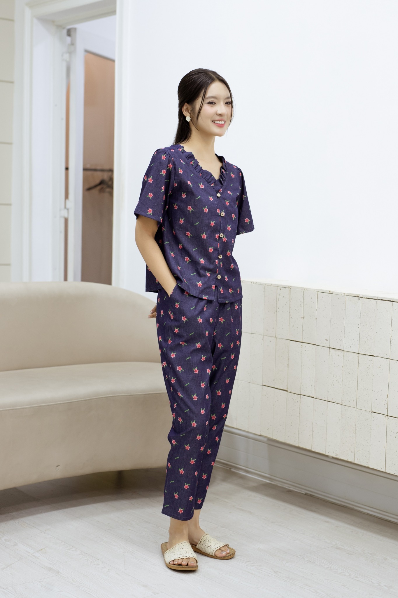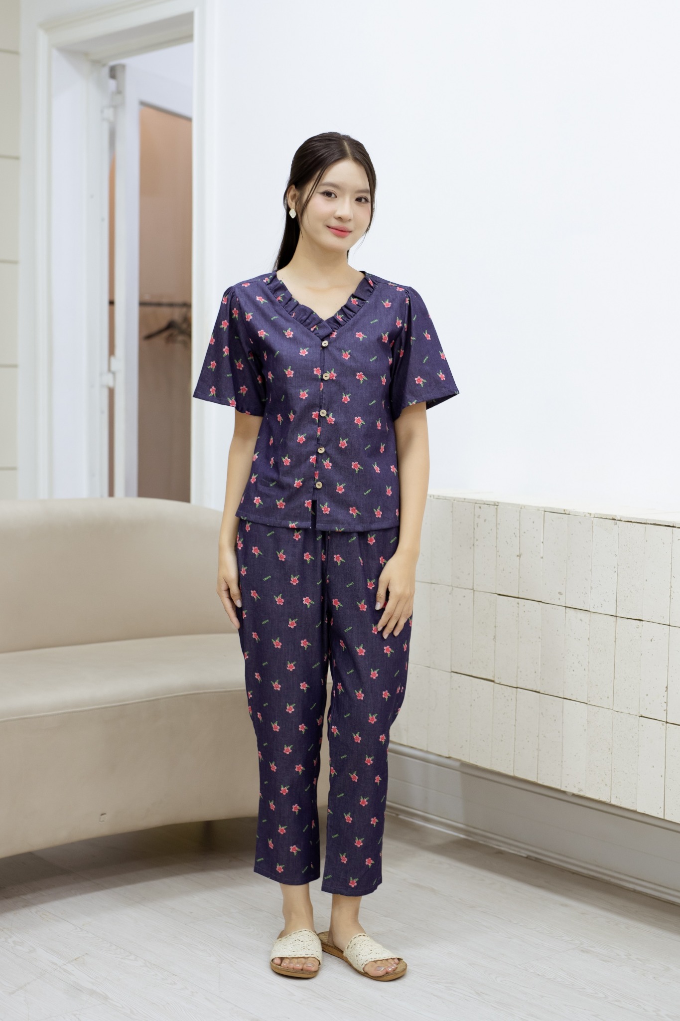 1. Đặc điểm nổi bật Đồ bộ dài thiết kế cổ bèo nút dây hoa đỏ