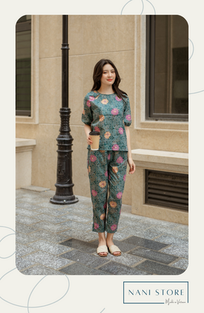 Đồ bộ dài thiết kế cổ giọt nước hoa sen Nani Store là thiết kế độc quyền, form dáng chuẩn, không đụng hàng. Đồ bộ mặc nhà thiết kế tiện lợi 2 trong 1, vừa mặc nhà, vừa dạo phố. Vải cotton giặt máy thoải mái, ít nhăn, thích hợp cho các chị ngại ủi. Phom giấu bụng rất tốt, vải mặc nhà không cần mặc áo bra. Đủ size từ 43-75kg.