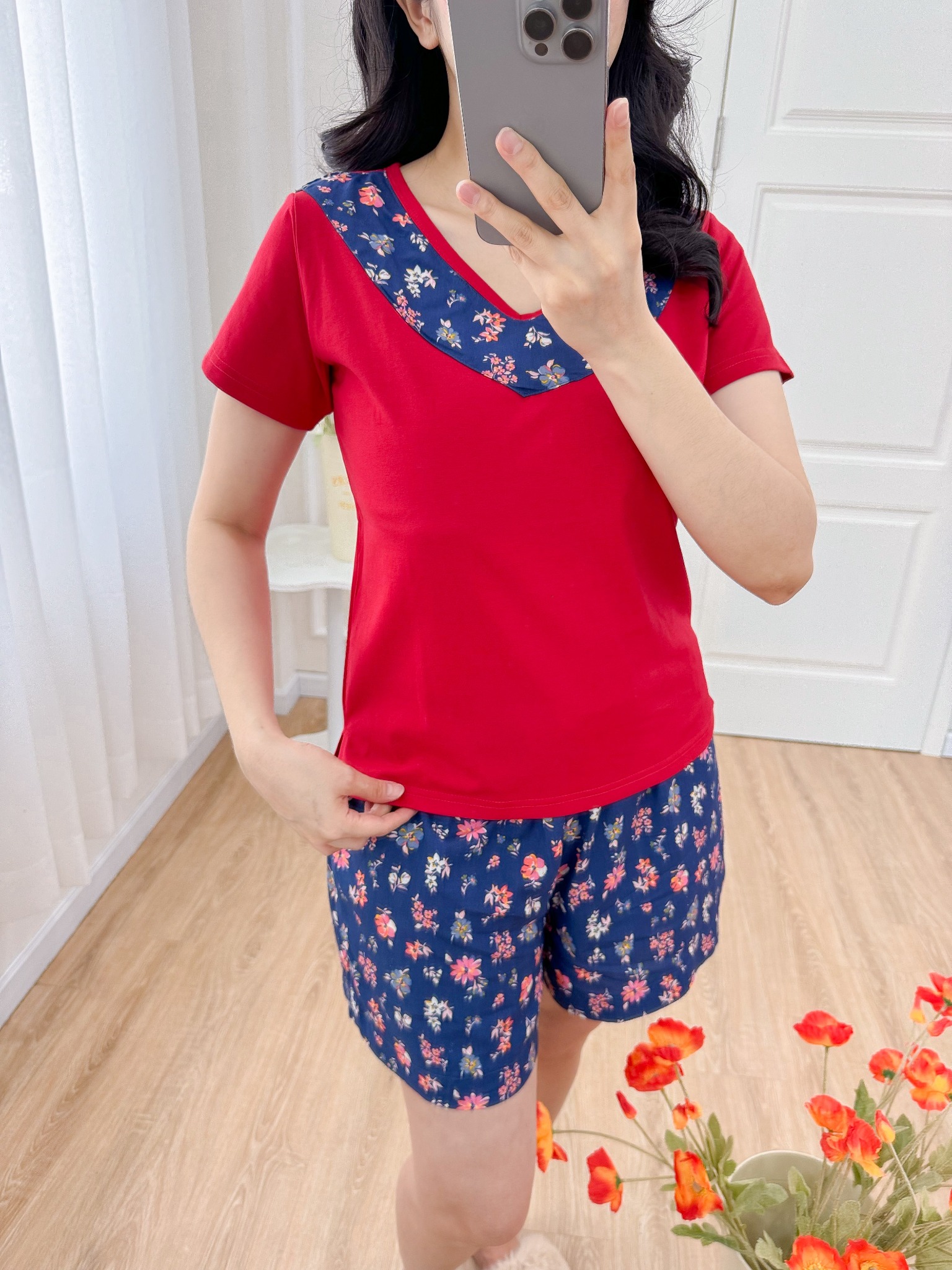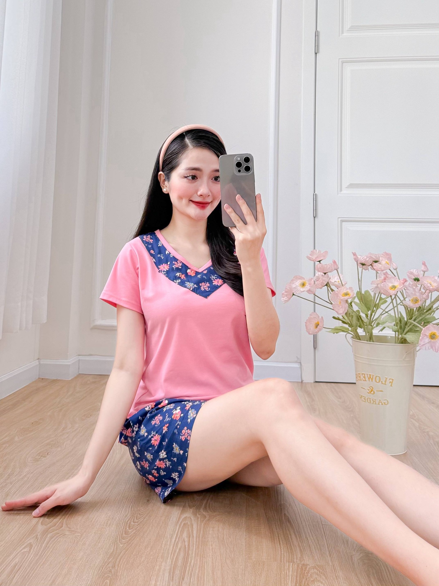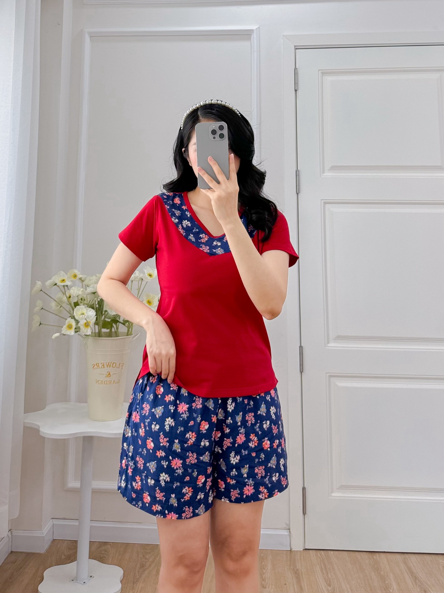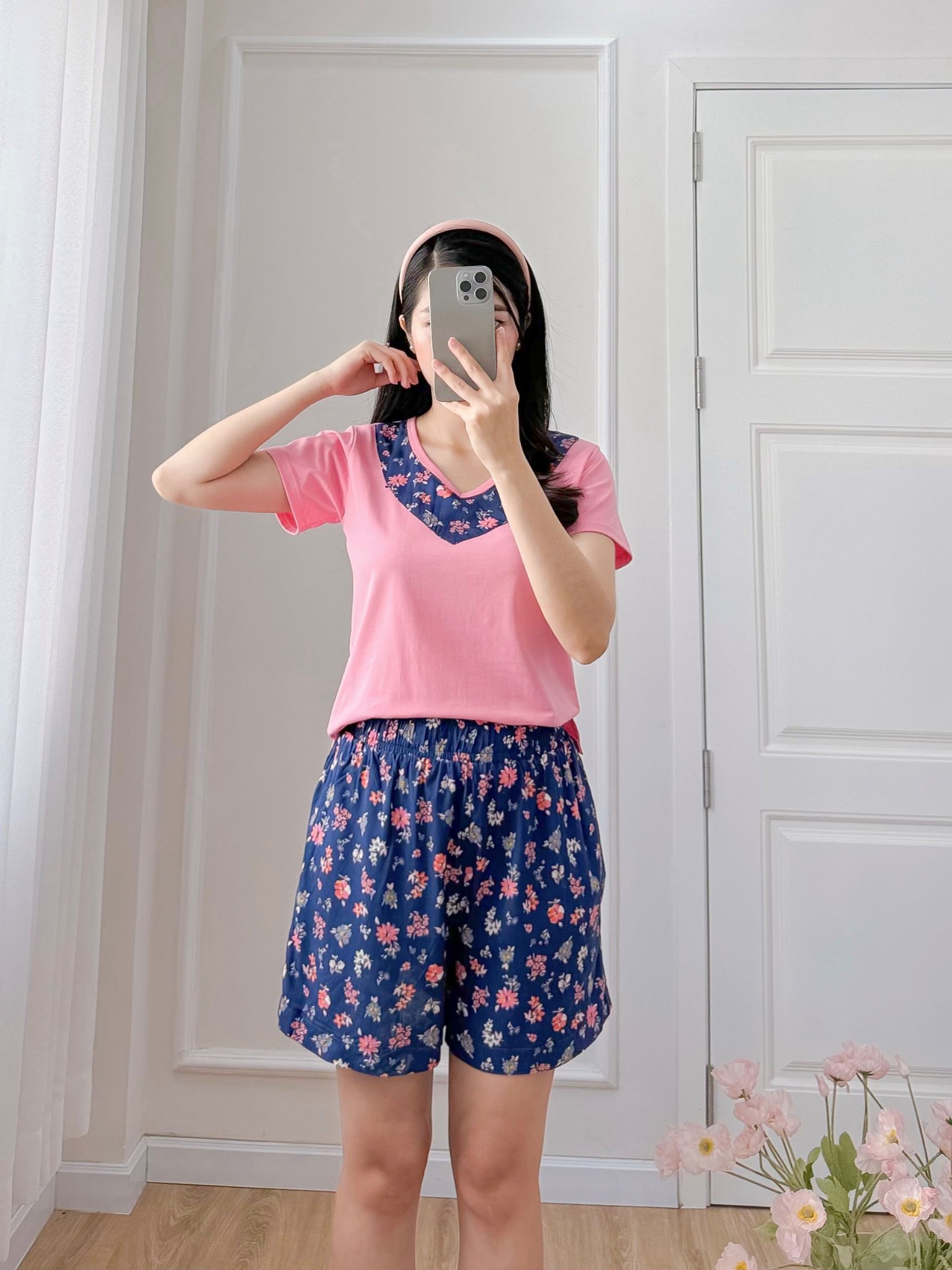 2. Mô tả chi tiết Đồ bộ đùi áo thun có viền cổ quần hoa mùa xuân: