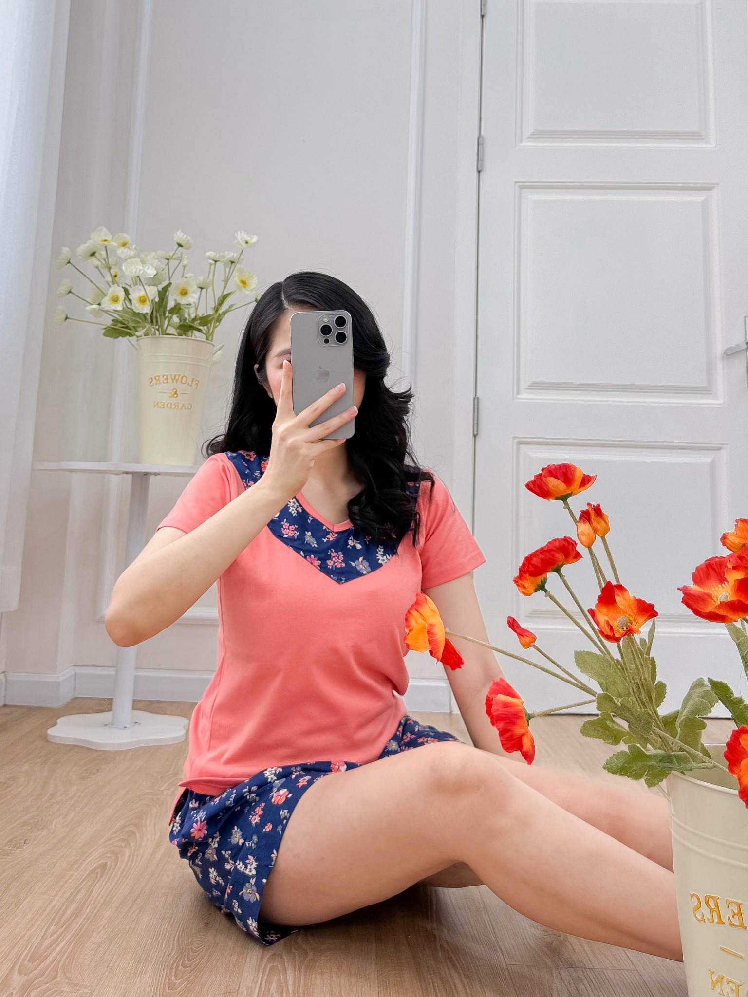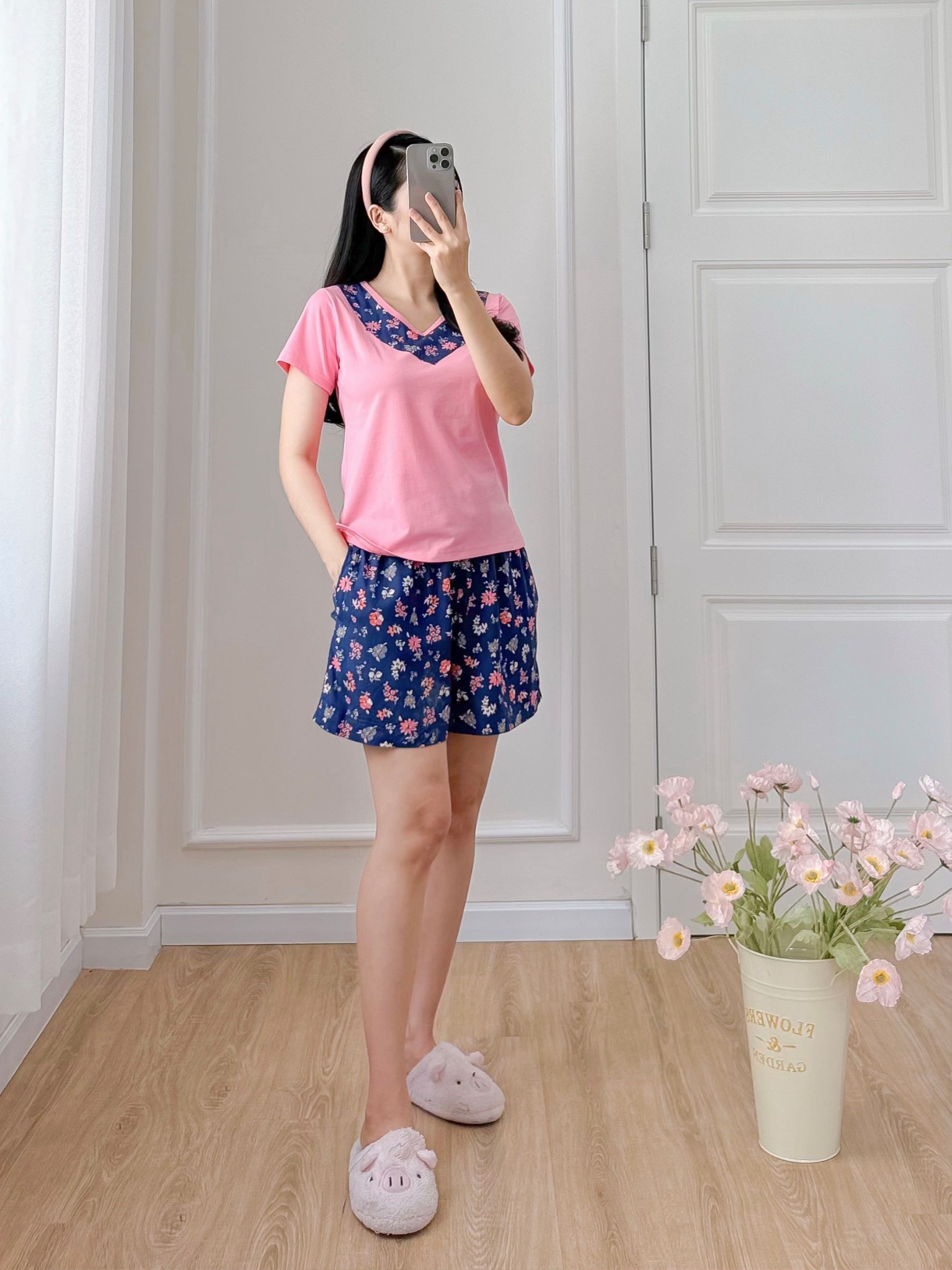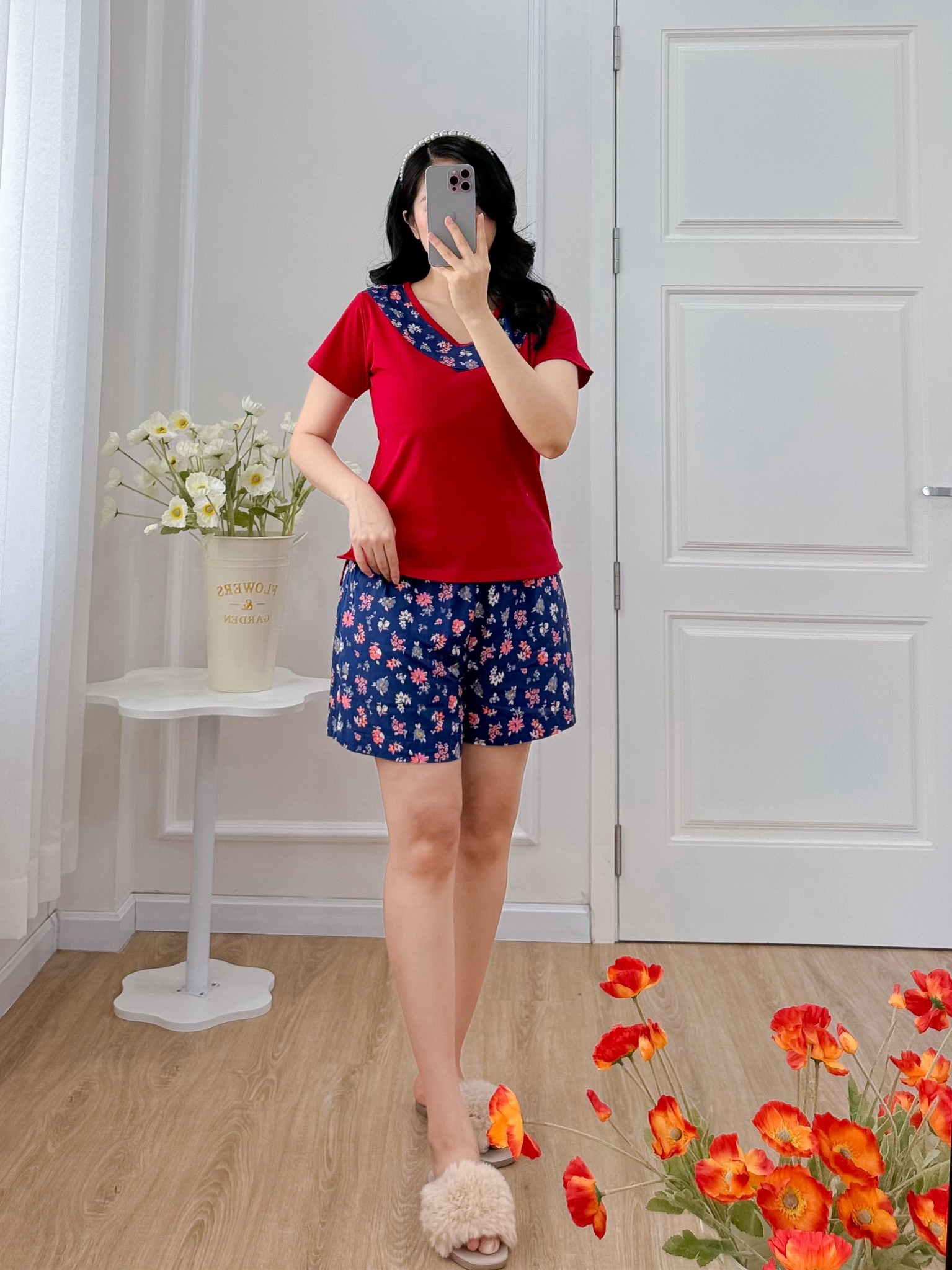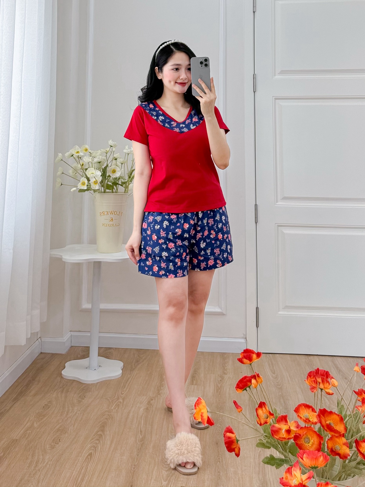 2. Mô tả chi tiết Đồ bộ đùi áo thun có viền cổ quần hoa mùa xuân: