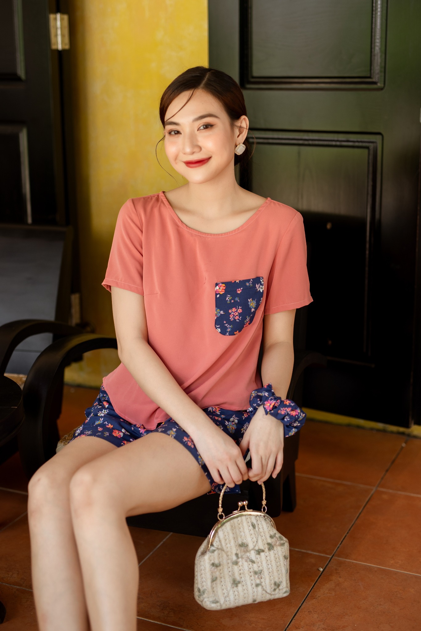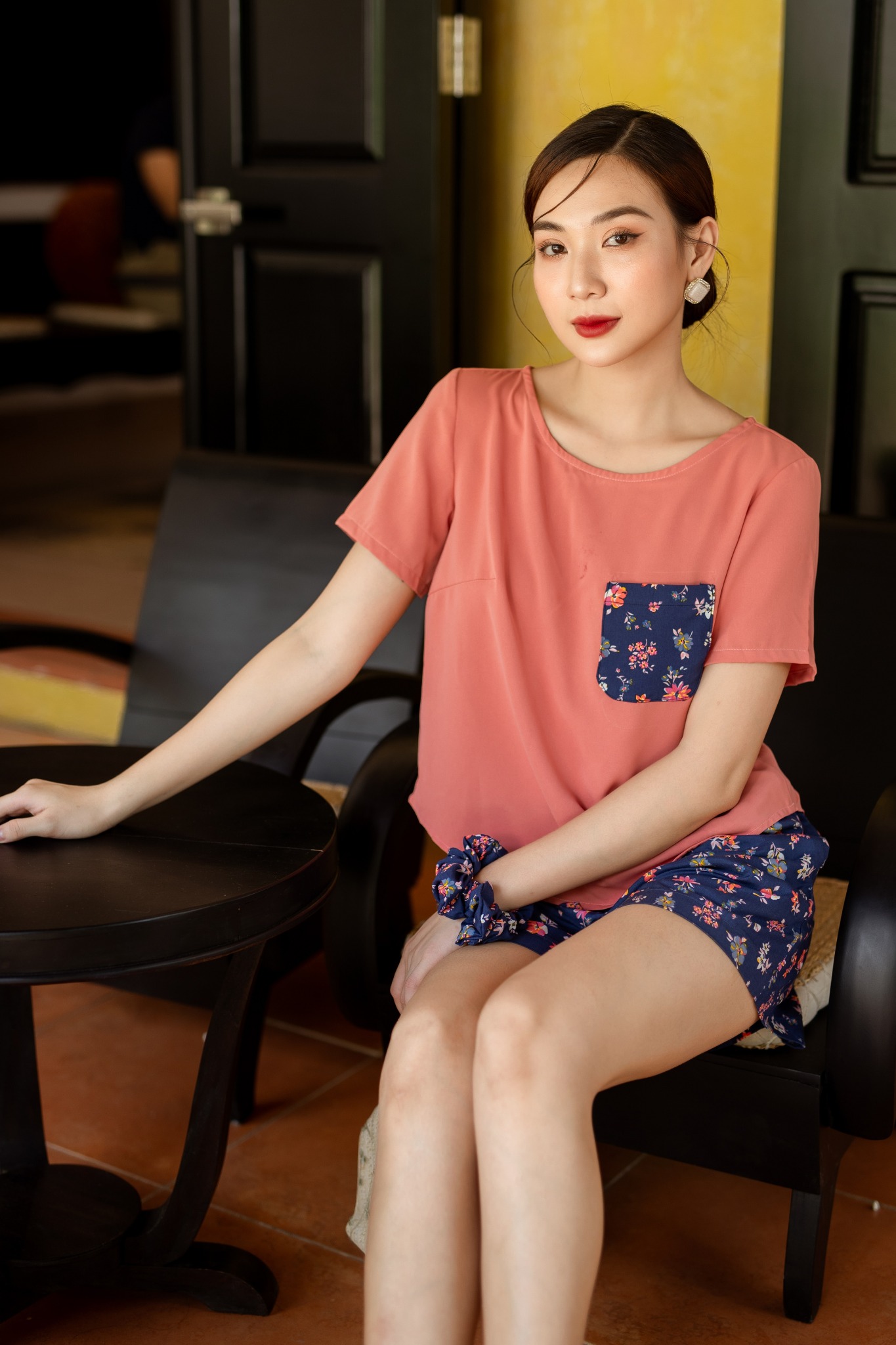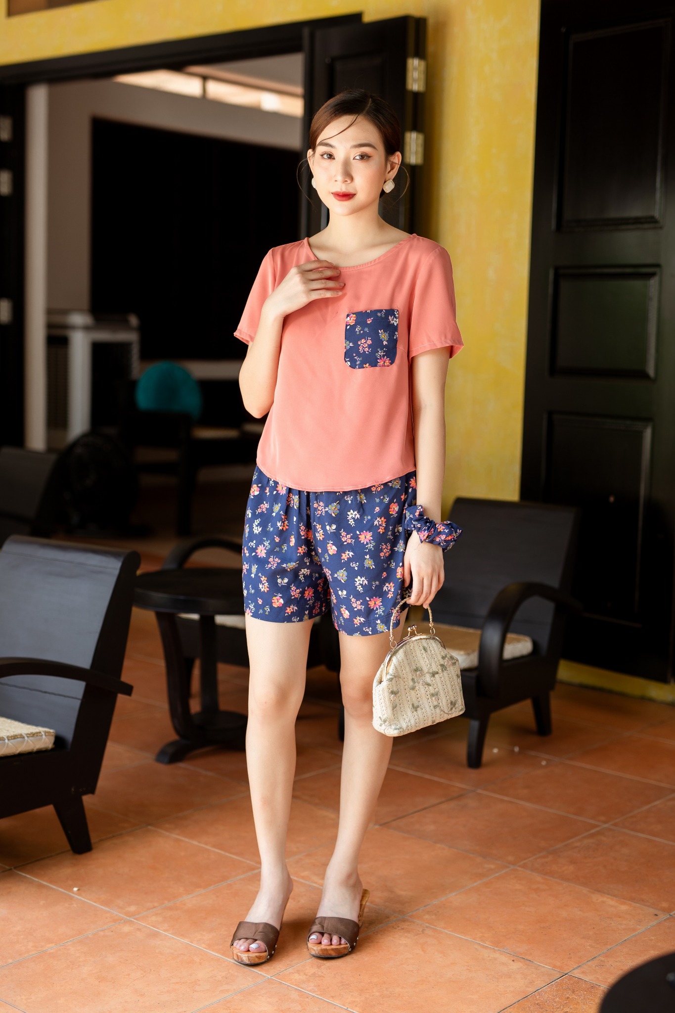 2. Mô tả chi tiết Đồ bộ đùi có tay áo hồng phối hoa mùa xuân