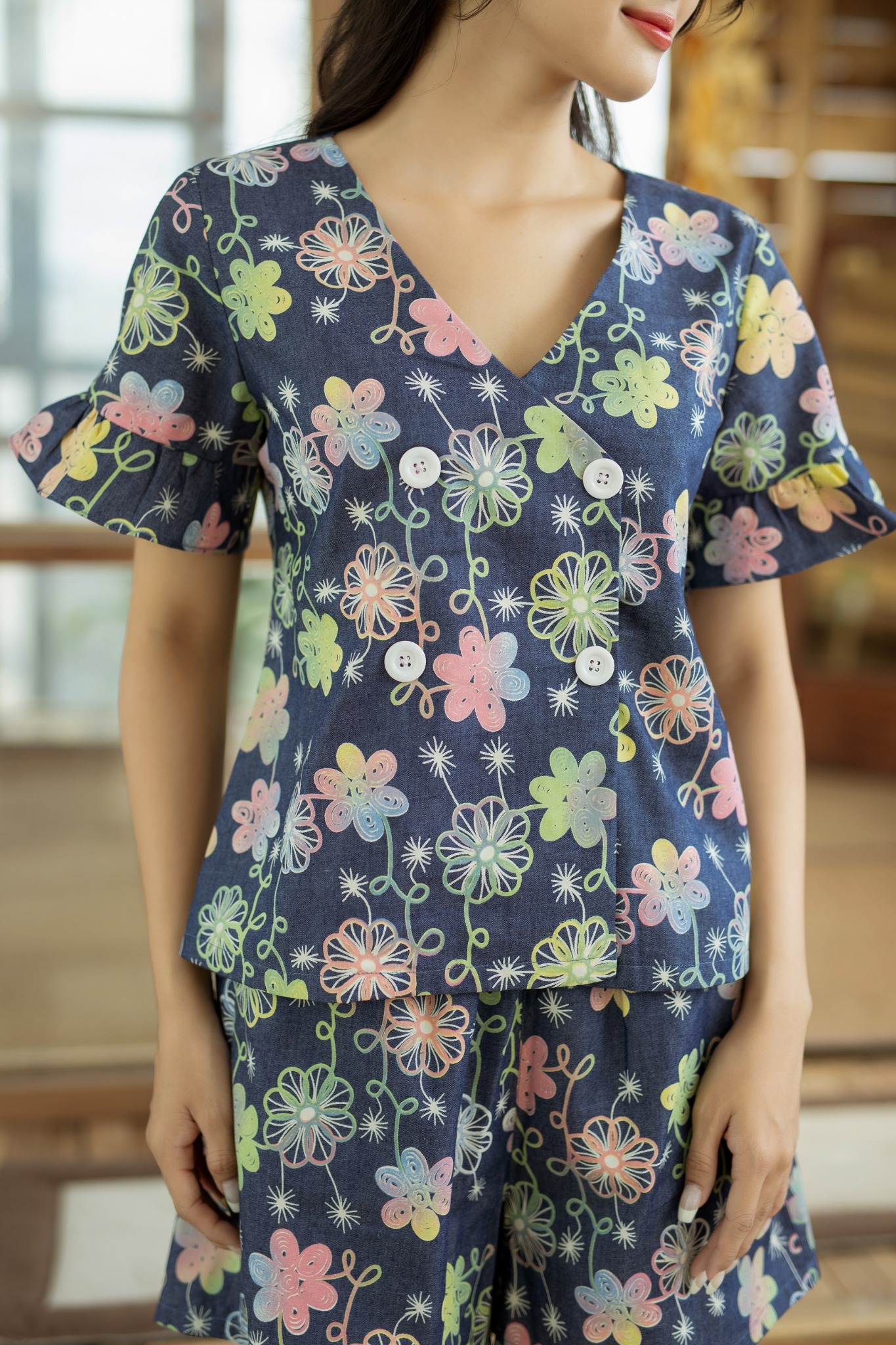 2. Mô tả chi tiết Đồ bộ đùi thiết kế có tay loe hoa 6 cánh