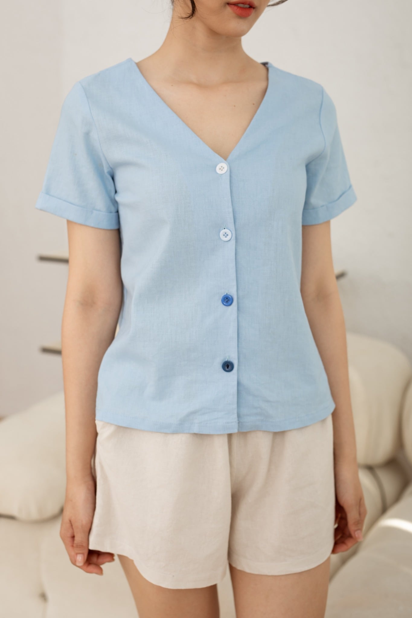 2. Mô tả chi tiết Đồ bộ đùi có tay nút nhiều màu xanh