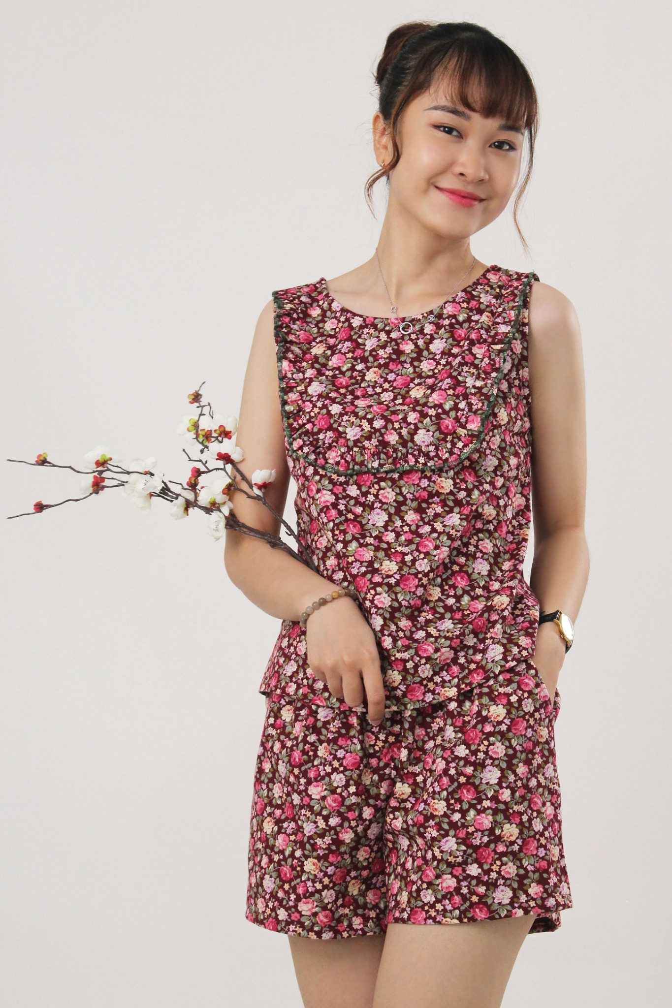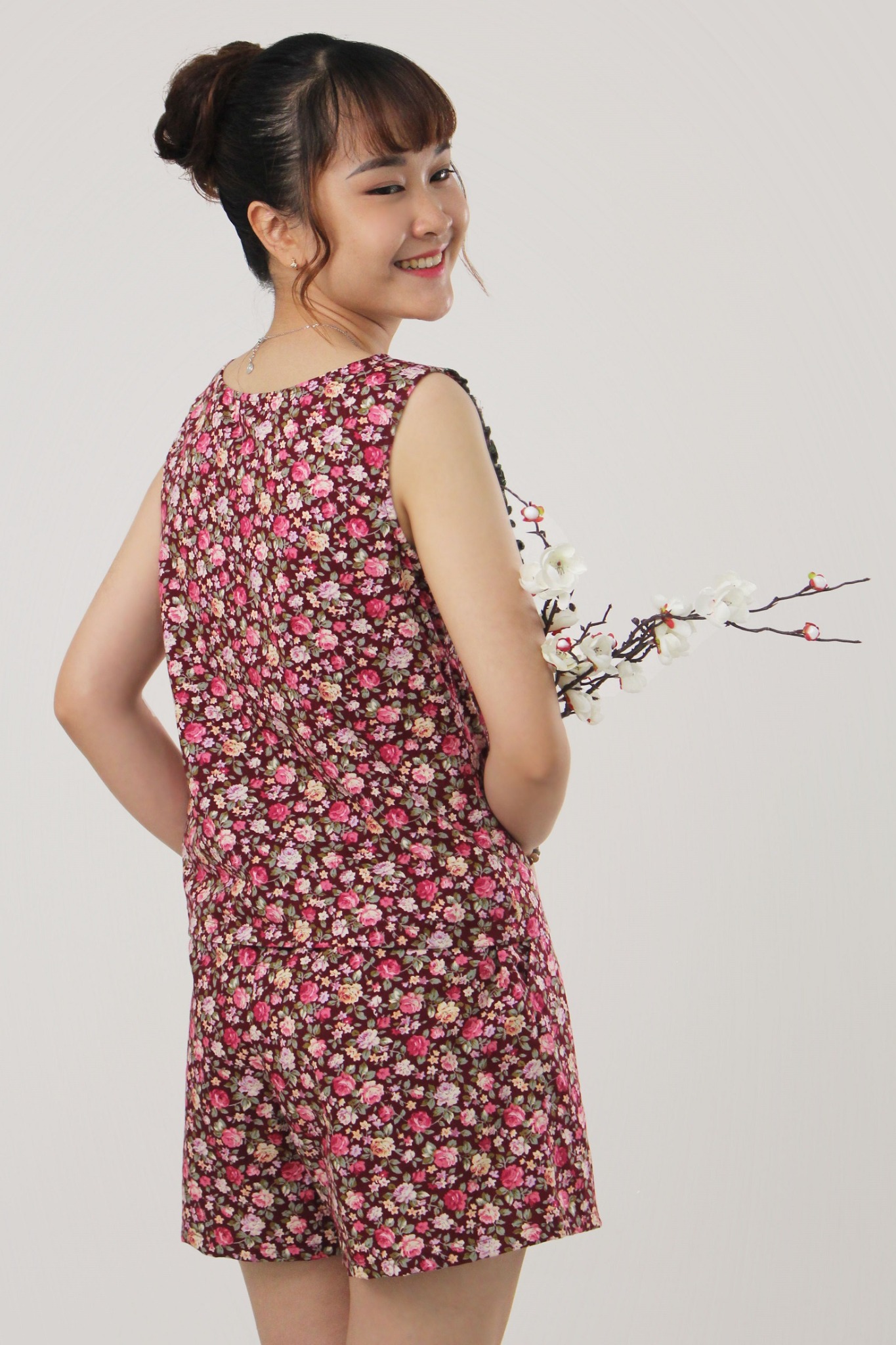 2. Mô tả chi tiết Đồ bộ đùi không tay cotton hoa hồng: