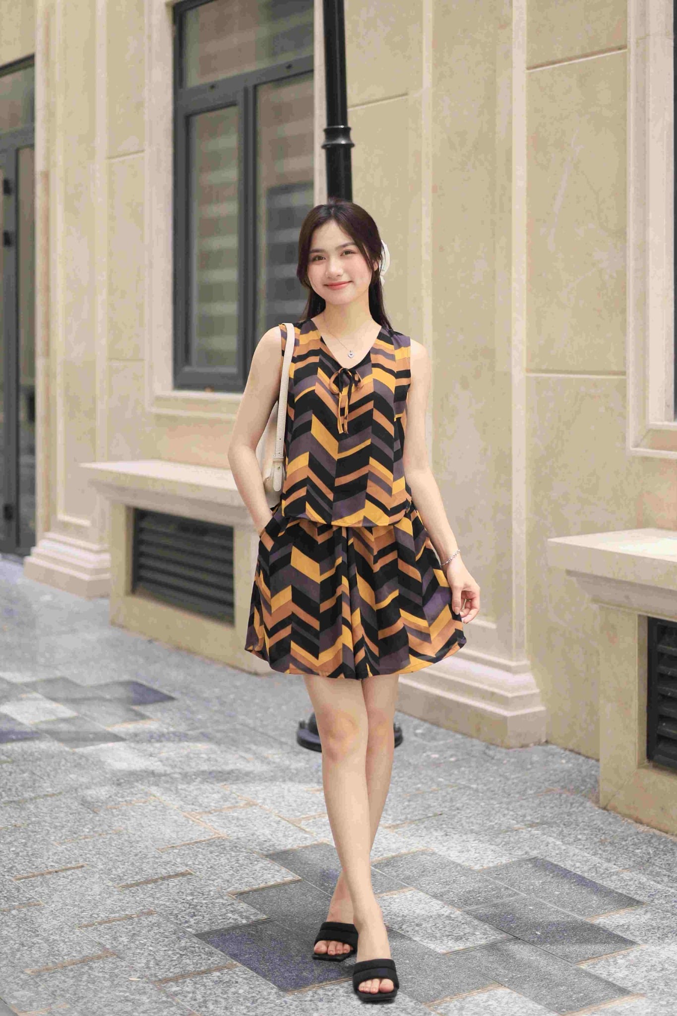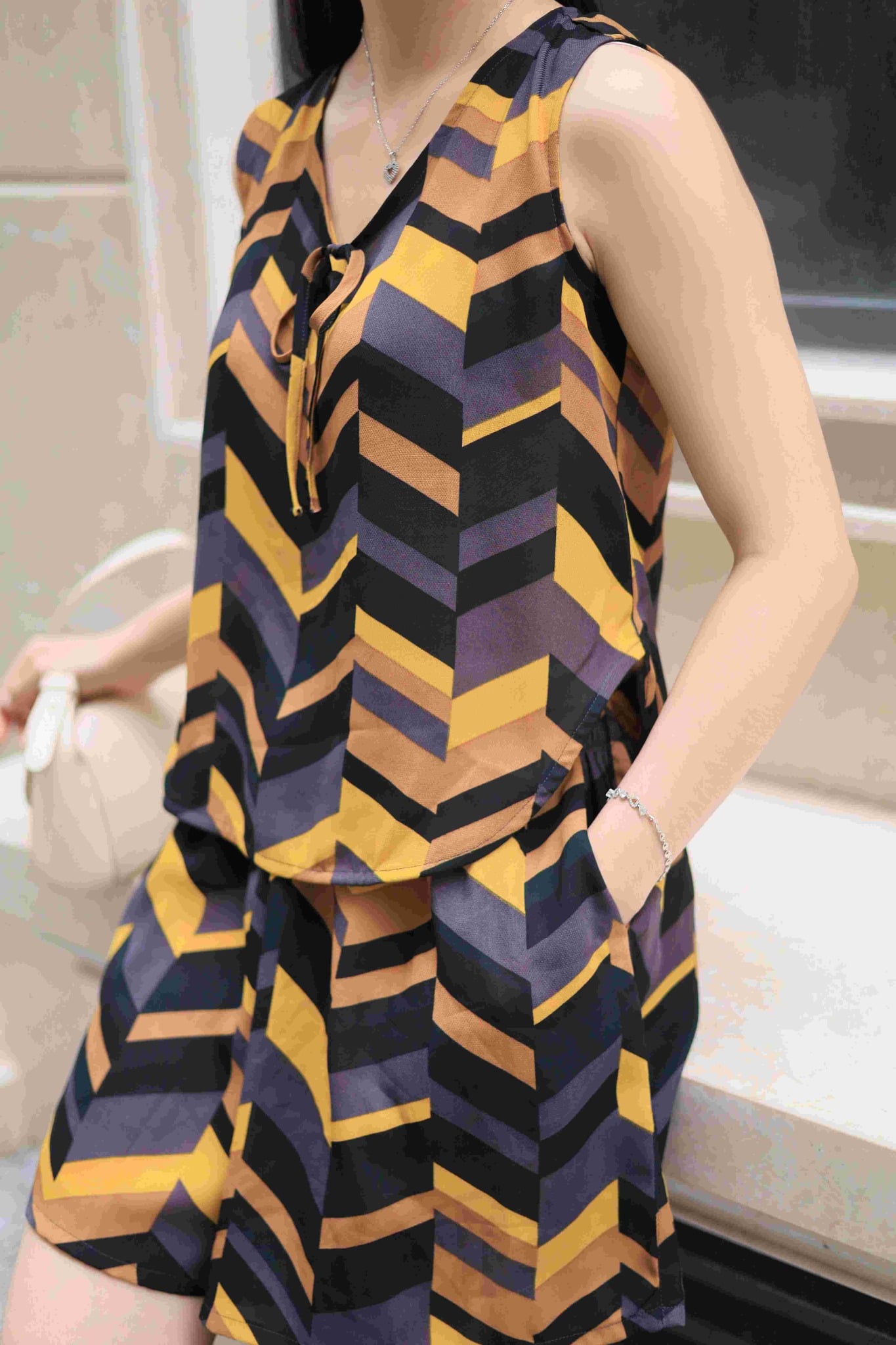 1. Đặc điểm nổi bật Đồ bộ đùi không tay nơ cổ đen vàng hoạ tiết Zigzag