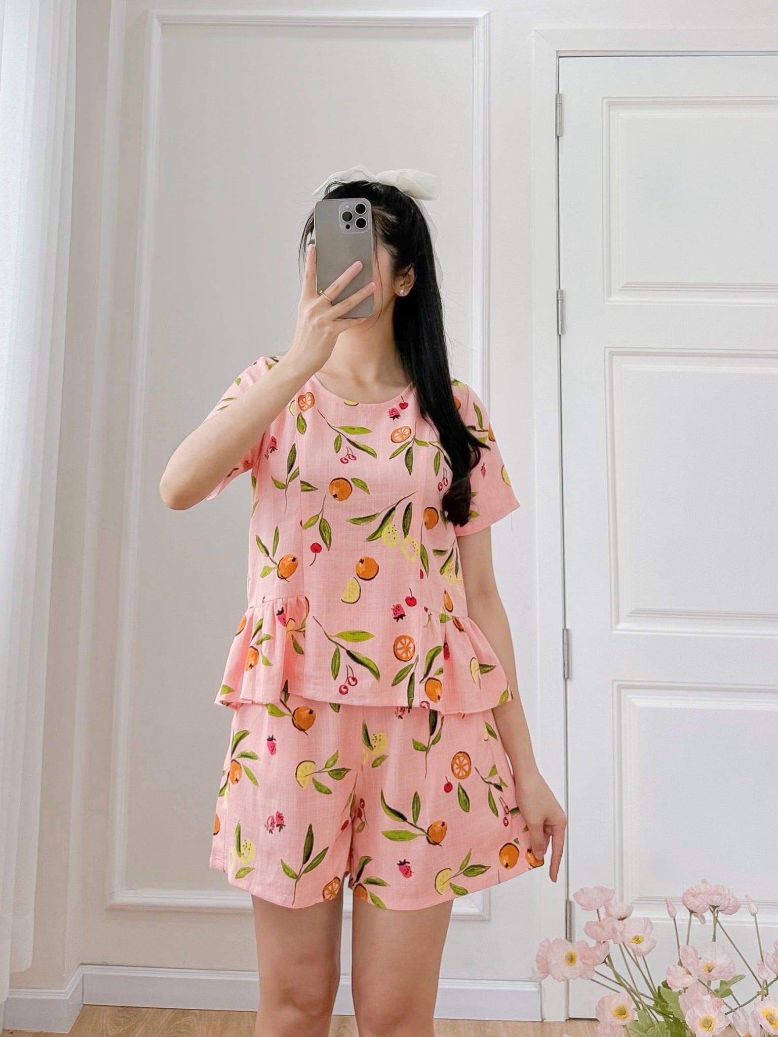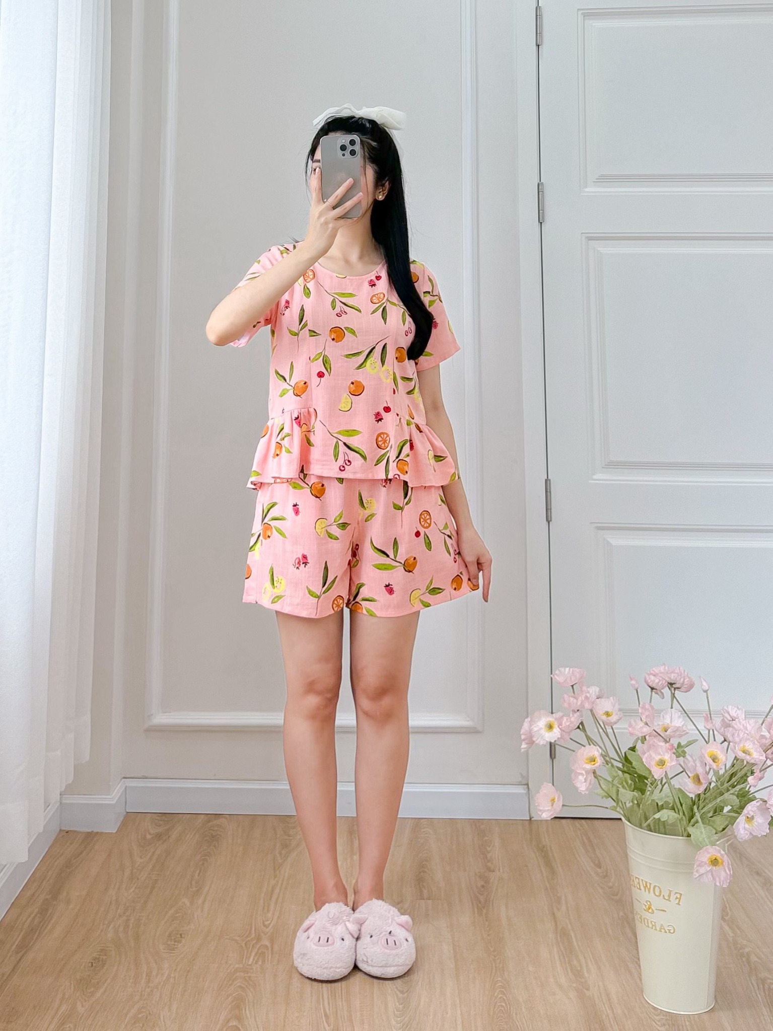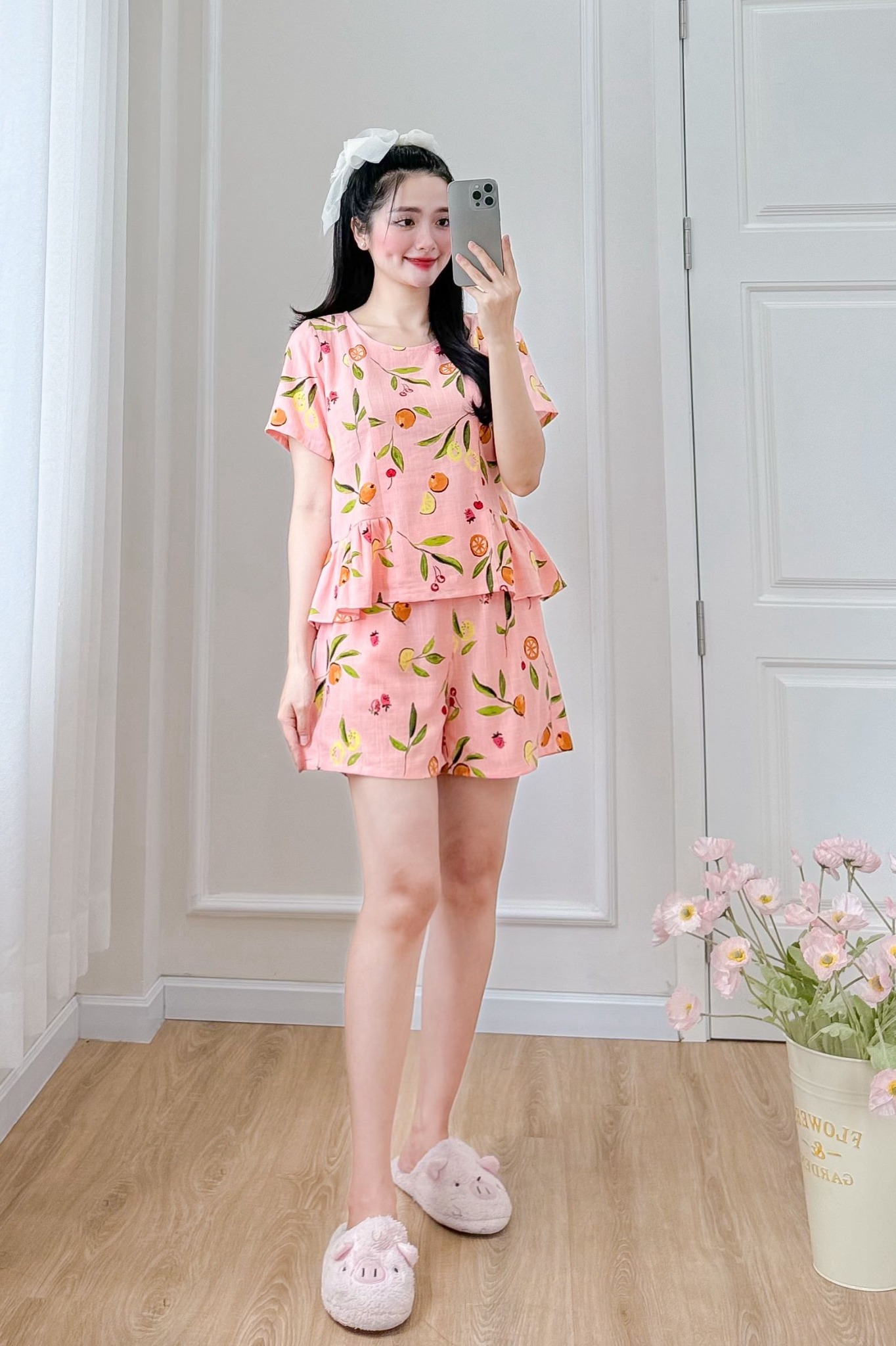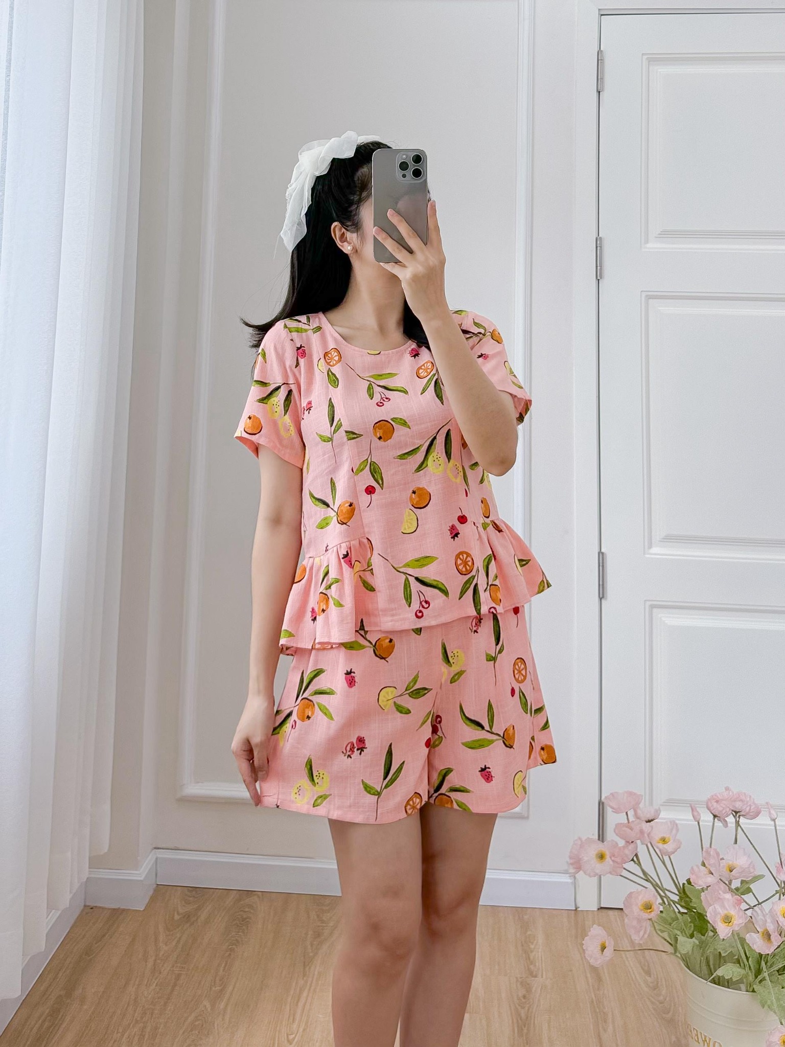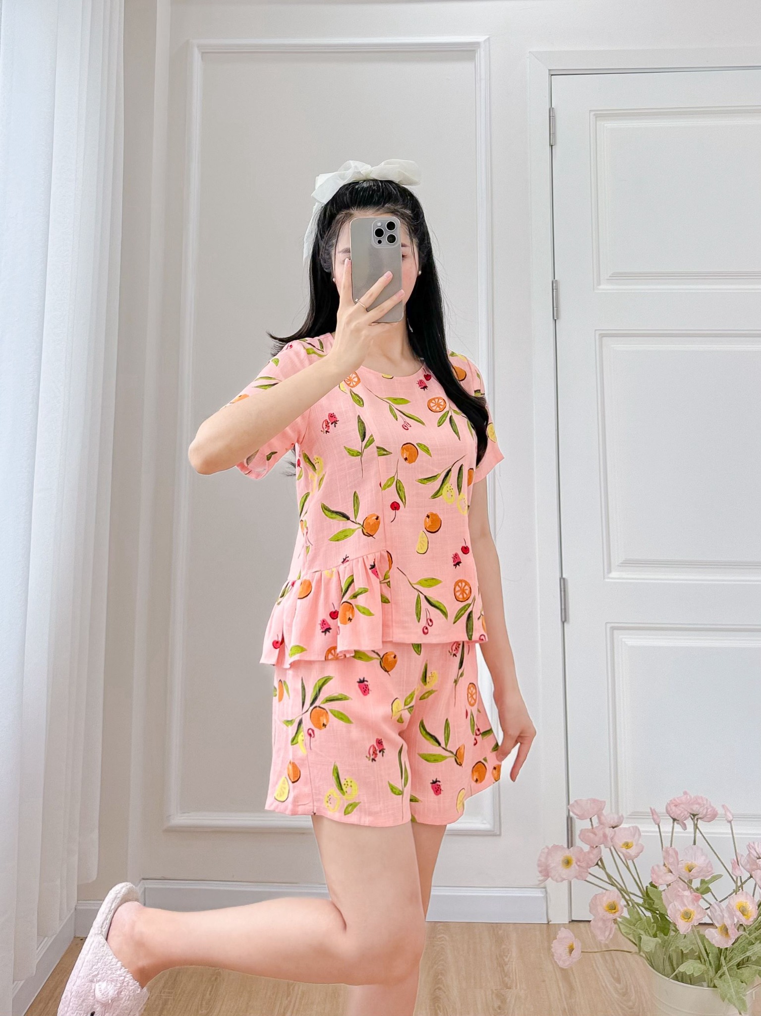 2. Mô tả chi tiết Đồ bộ đùi nhún bèo linen có tay hồng cam