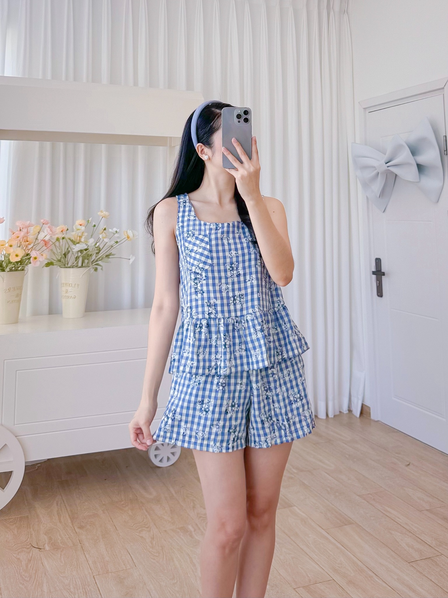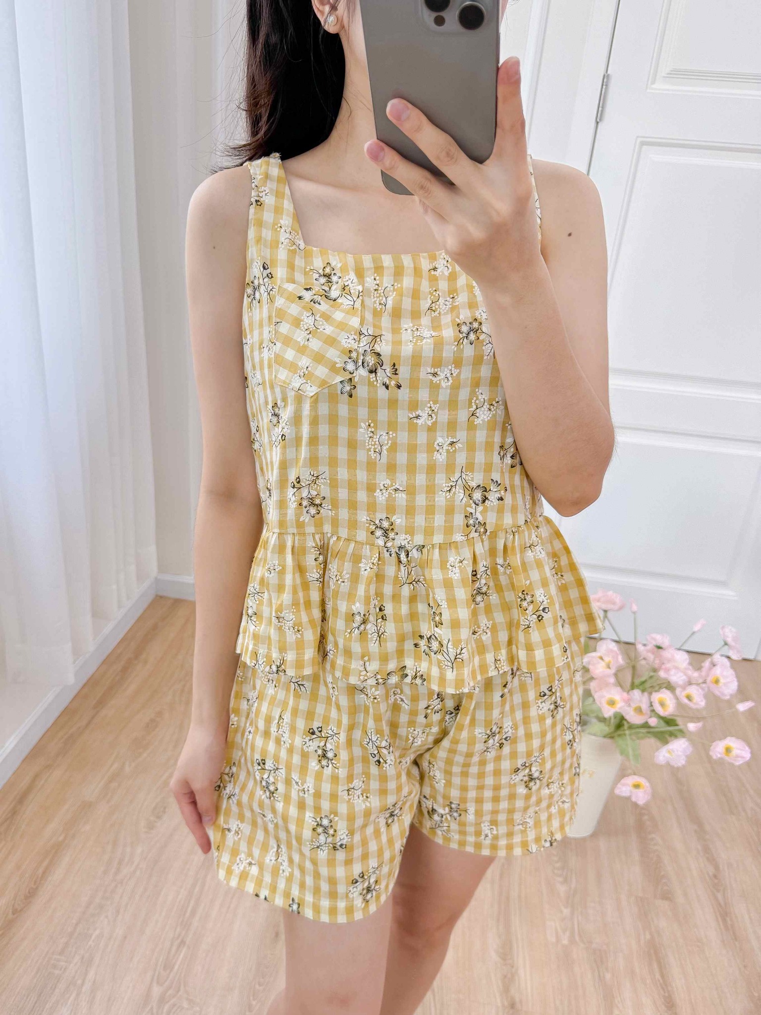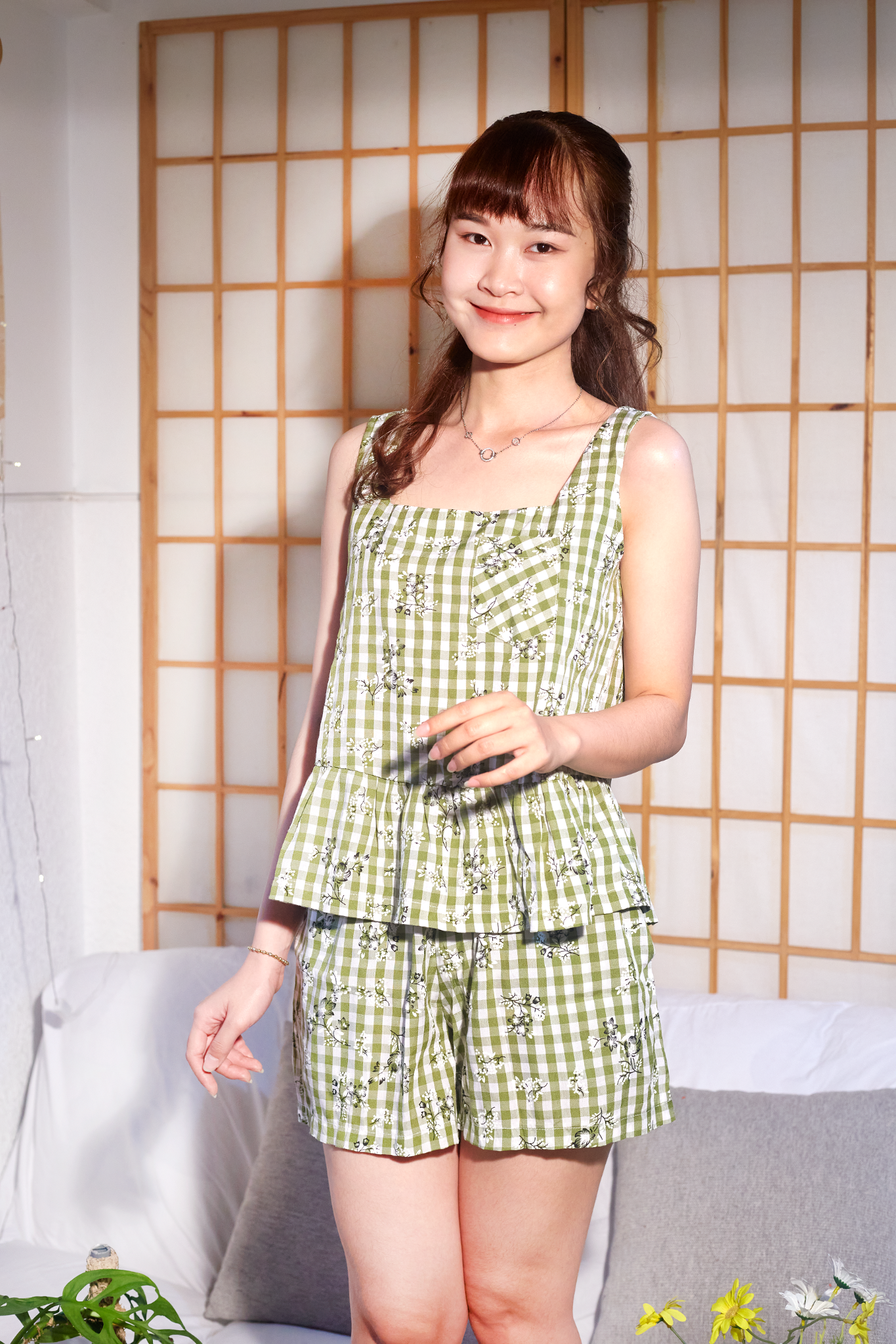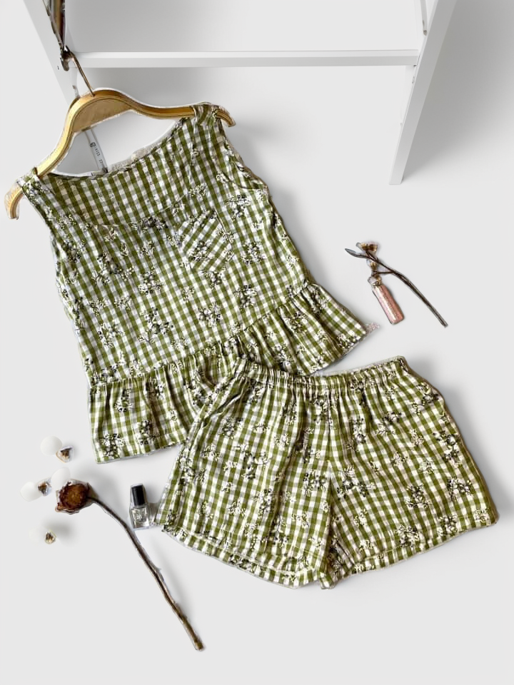 2. Mô tả chi tiết Đồ bộ đùi sọc caro họa tiết hoa bèo không tay_SA