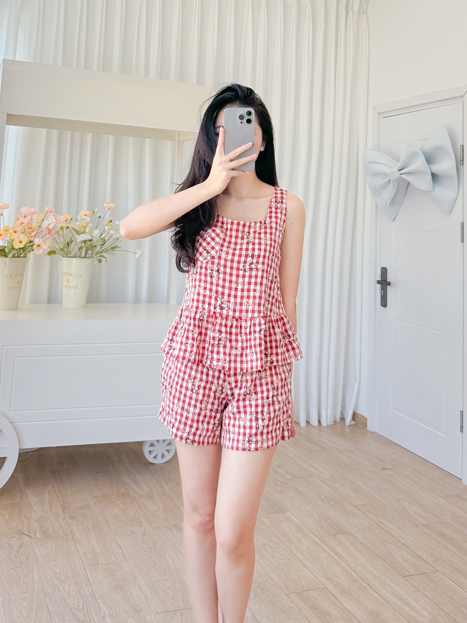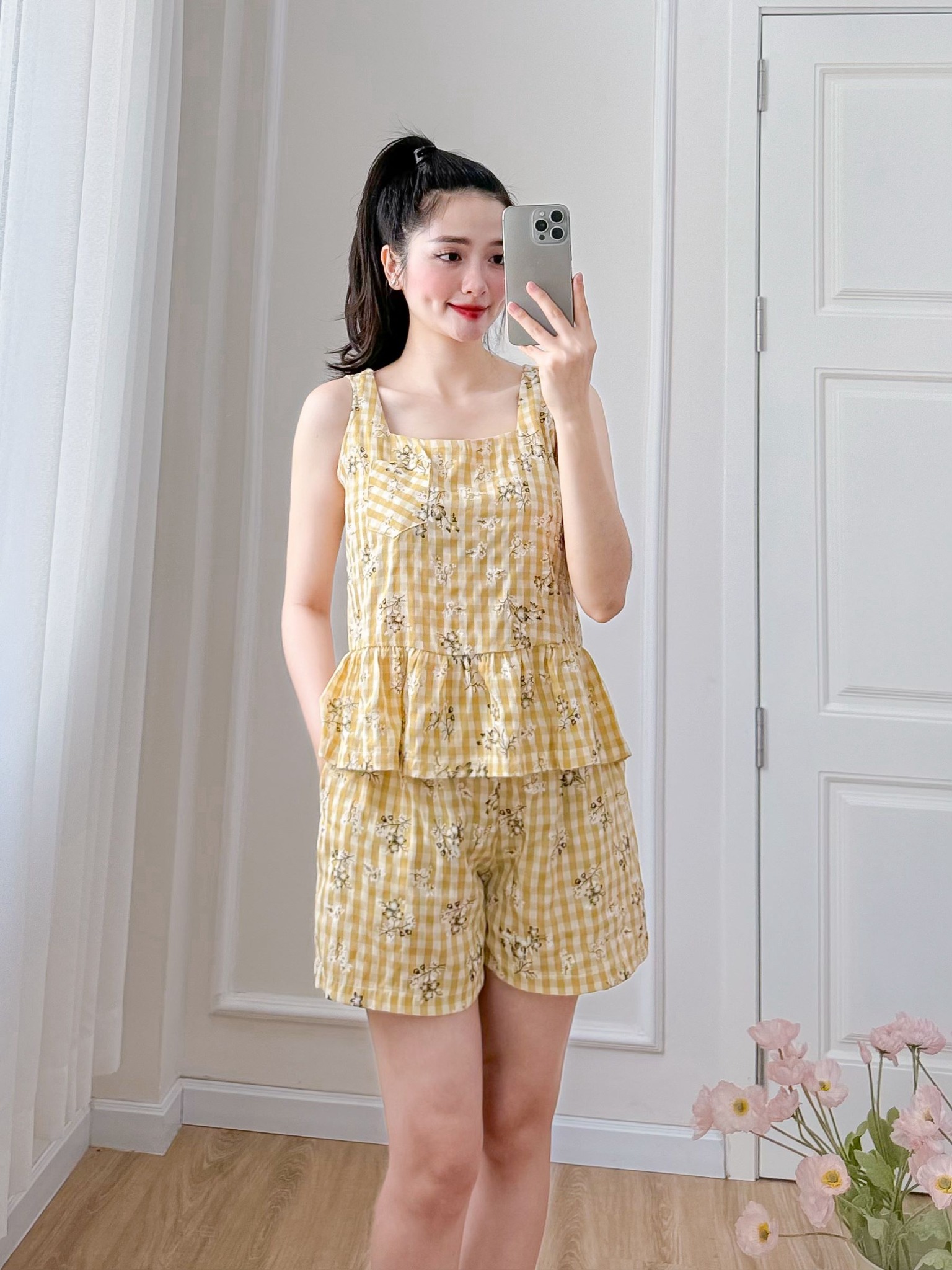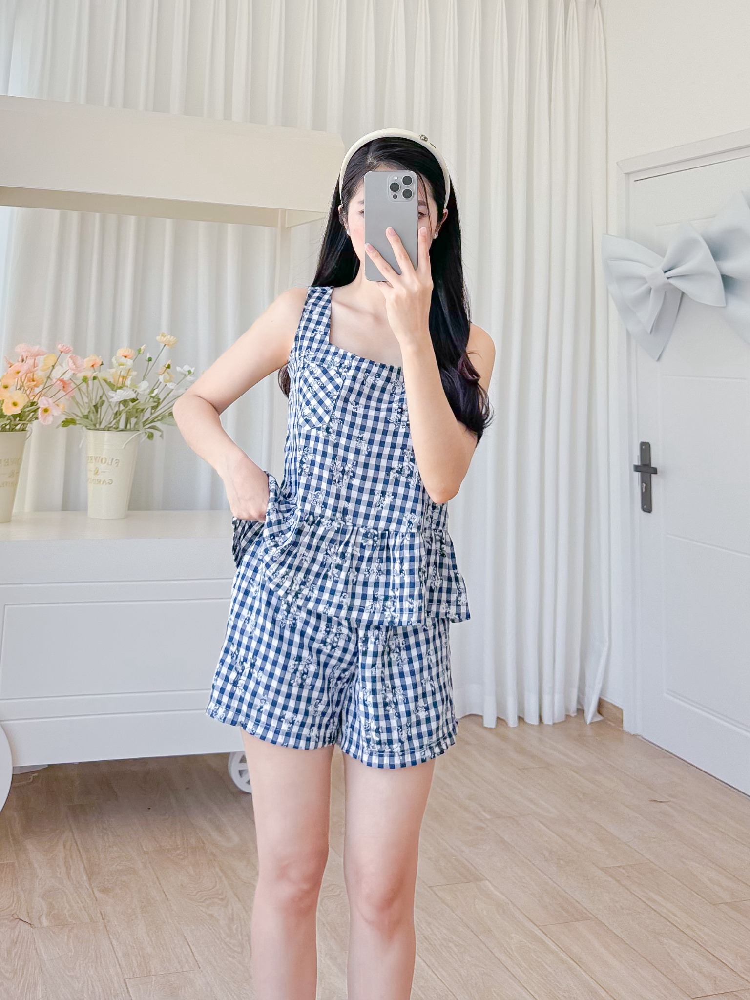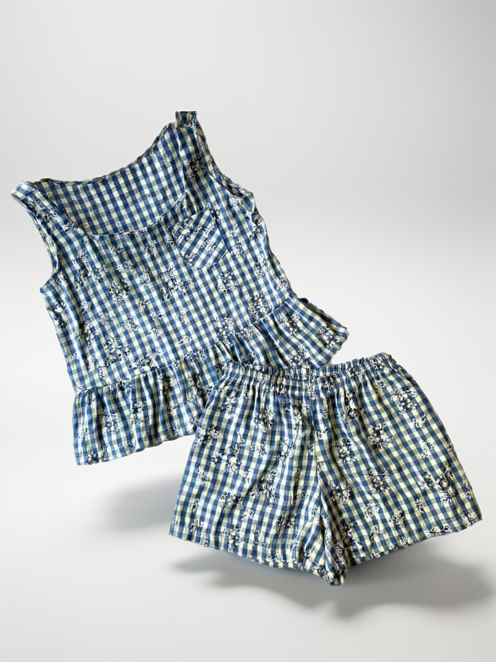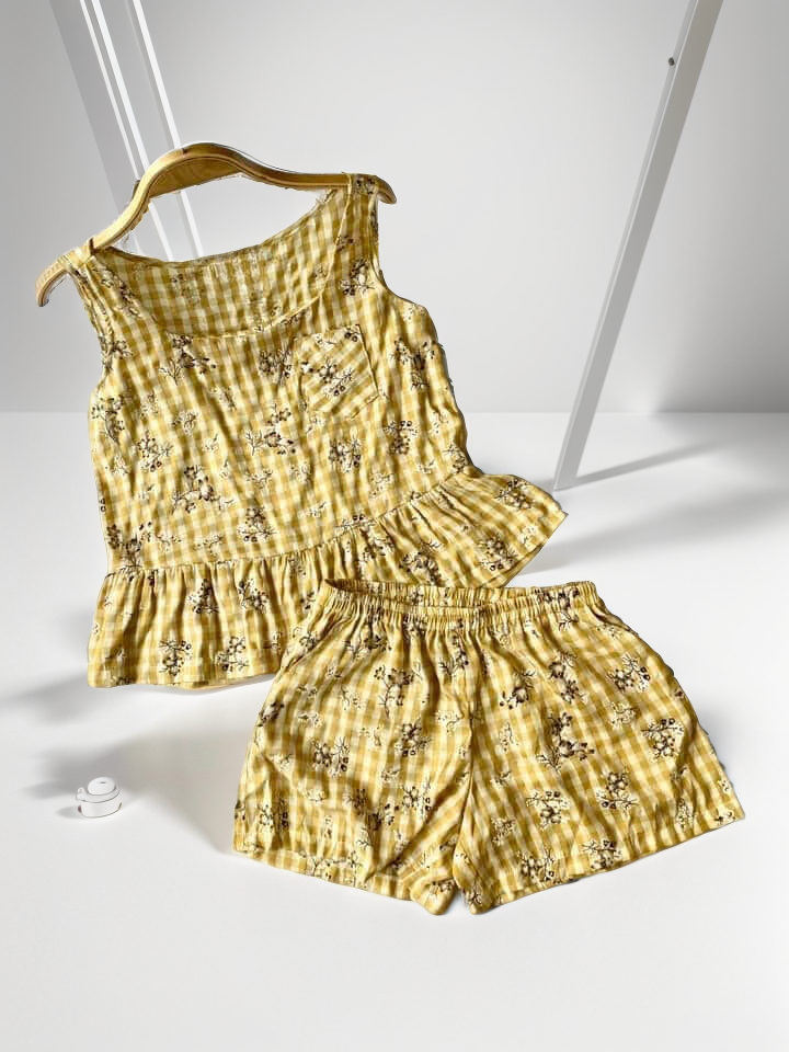 Đồ bộ đùi sọc caro họa tiết hoa bèo không tay_SA Nani Store là thiết kế độc quyền, form dáng chuẩn, không đụng hàng. Đồ bộ mặc nhà thiết kế tiện lợi 2 trong 1, vừa mặc nhà, vừa dạo phố. Vải cotton giặt máy thoải mái, ít nhăn, thích hợp cho các chị ngại ủi. Phom giấu bụng rất tốt, vải mặc nhà không cần mặc áo bra. Đủ size từ 43-75kg.