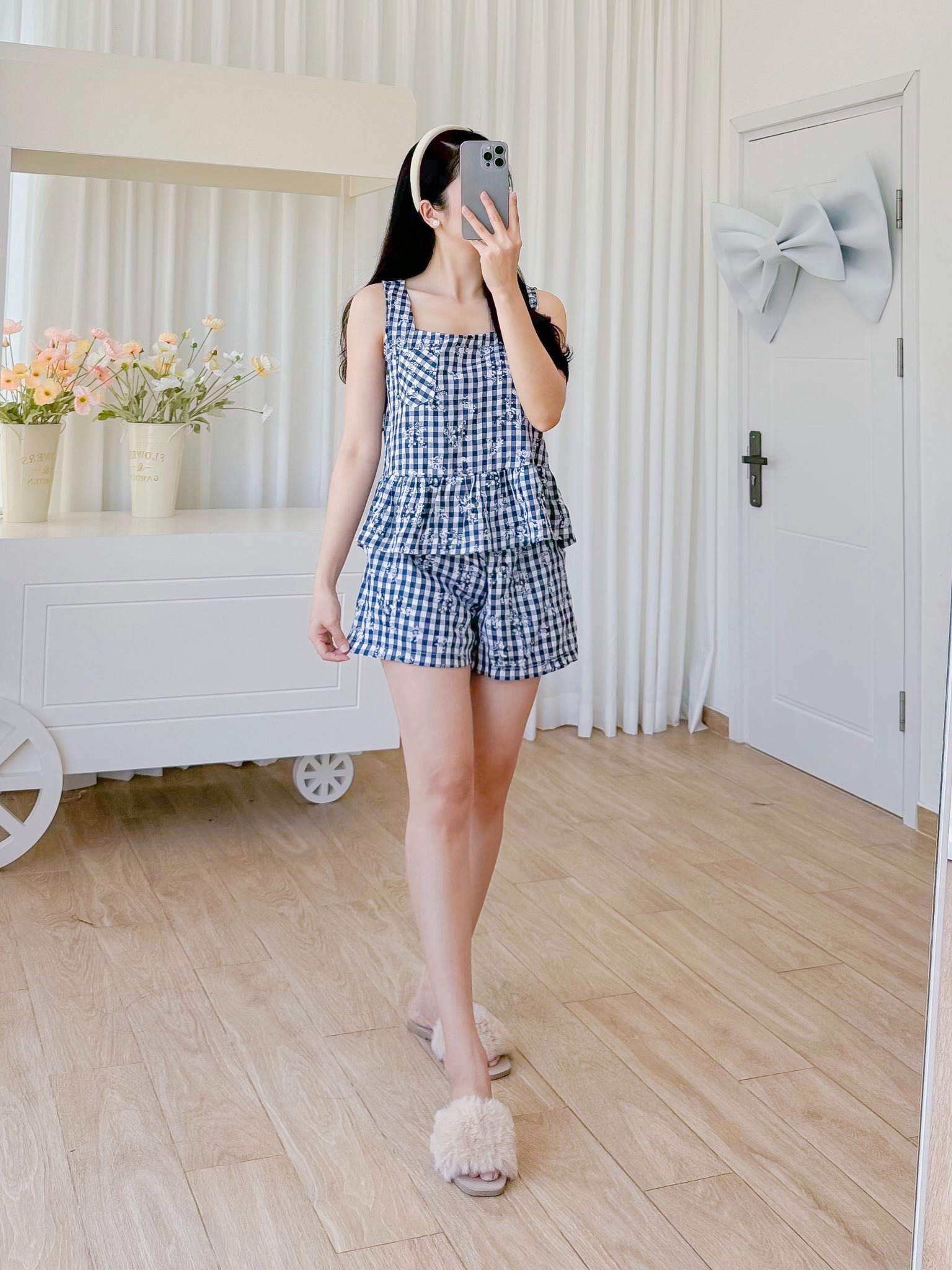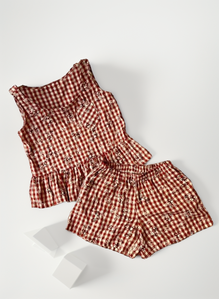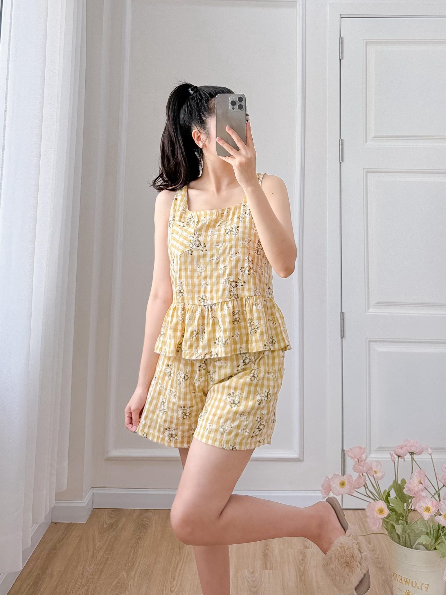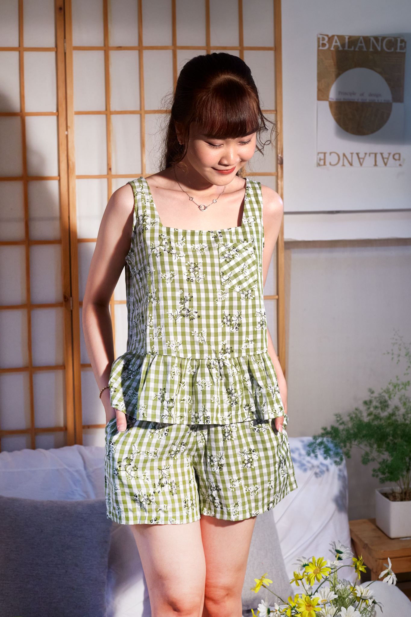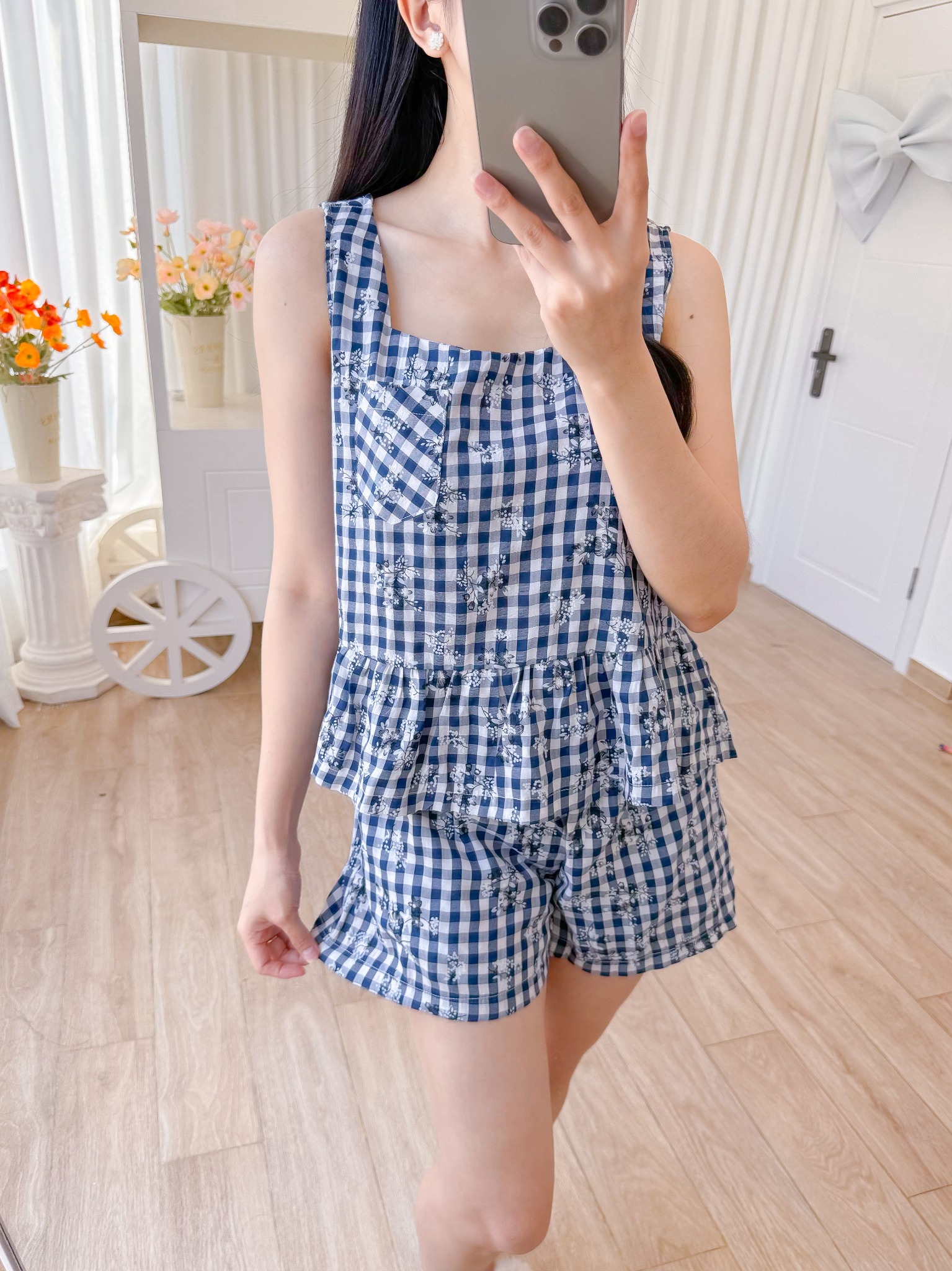 Đồ bộ đùi sọc caro họa tiết hoa bèo không tay_SA Nani Store là thiết kế độc quyền, form dáng chuẩn, không đụng hàng. Đồ bộ mặc nhà thiết kế tiện lợi 2 trong 1, vừa mặc nhà, vừa dạo phố. Vải cotton giặt máy thoải mái, ít nhăn, thích hợp cho các chị ngại ủi. Phom giấu bụng rất tốt, vải mặc nhà không cần mặc áo bra. Đủ size từ 43-75kg.