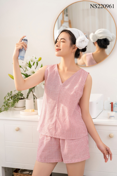 1. Đặc điểm nổi bật Đồ bộ đùi không tay sọc đỏ vạt chéo sau lưng