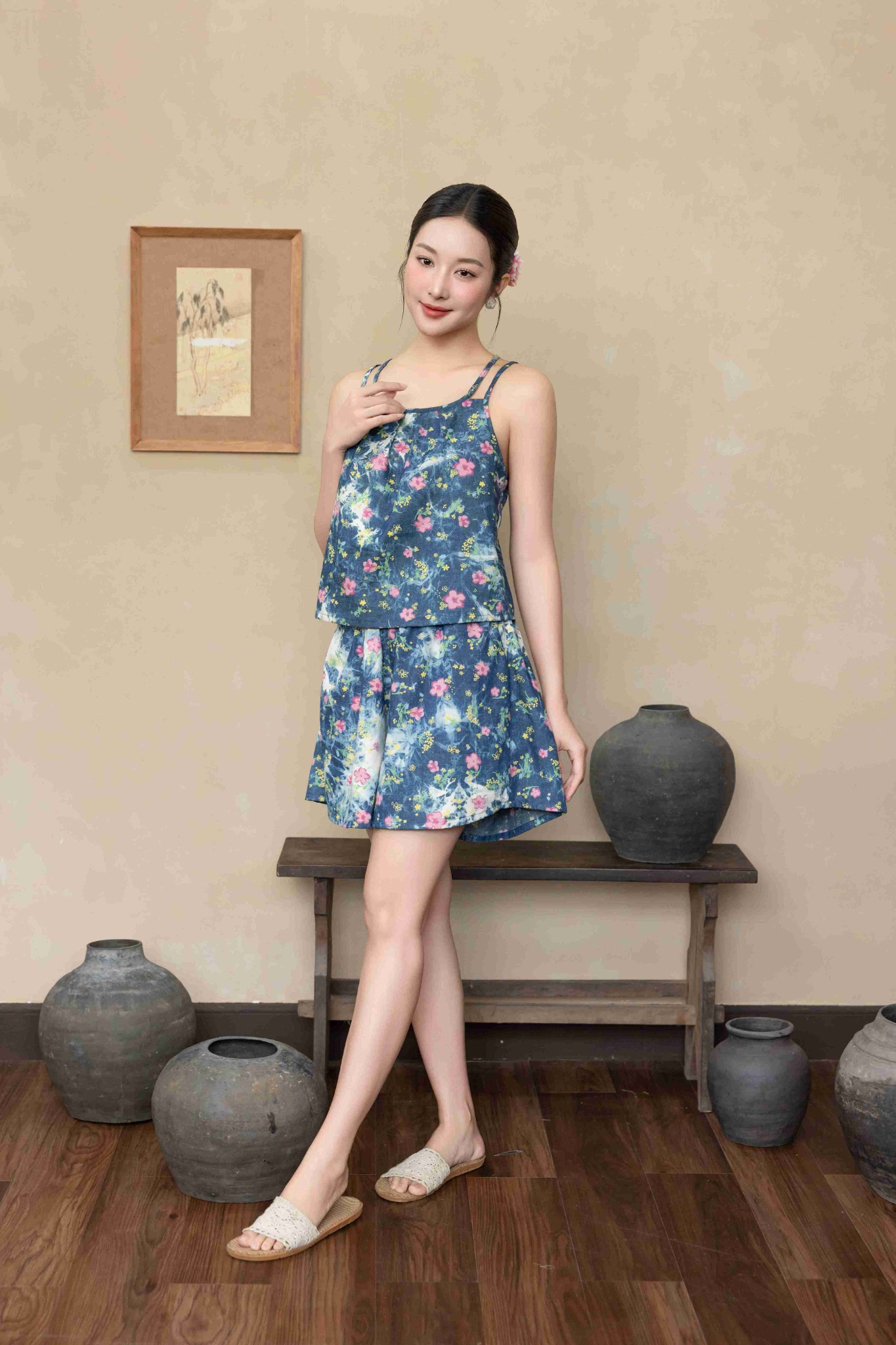 2. Mô tả chi tiết Đồ bộ đùi thiết kế 2 dây hoa đào hồng