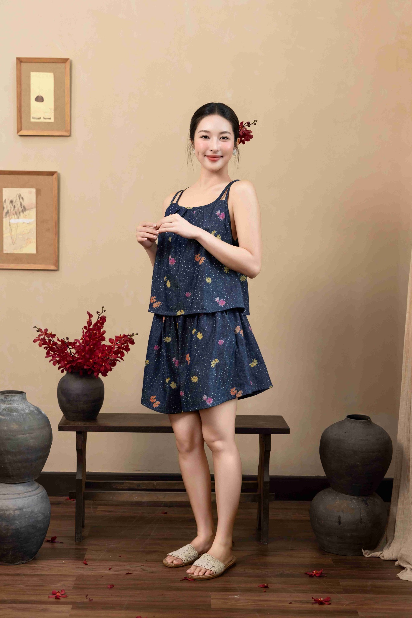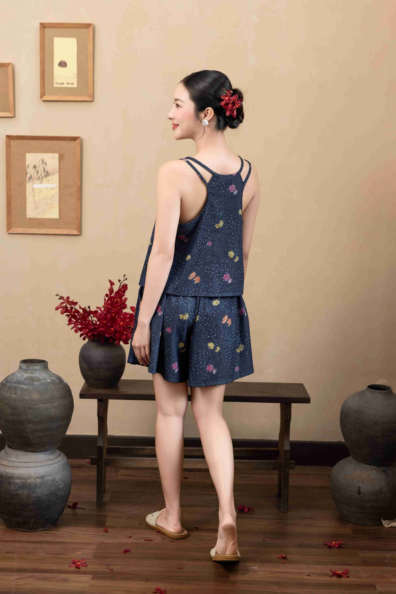 Đồ bộ đùi thiết kế 2 dây hoa đồng tiền NaNi Store là thiết kế độc quyền, form dáng chuẩn, không đụng hàng. Đồ bộ mặc nhà thiết kế tiện lợi, vừa mặc nhà, vừa dạo phố. Vải denim ít nhăn, thích hợp cho các chị ngại ủi. Phom giấu bụng rất tốt, vải mặc nhà mềm mại, mỏng nhẹ thoải mái. Đủ size từ 43-75kg.