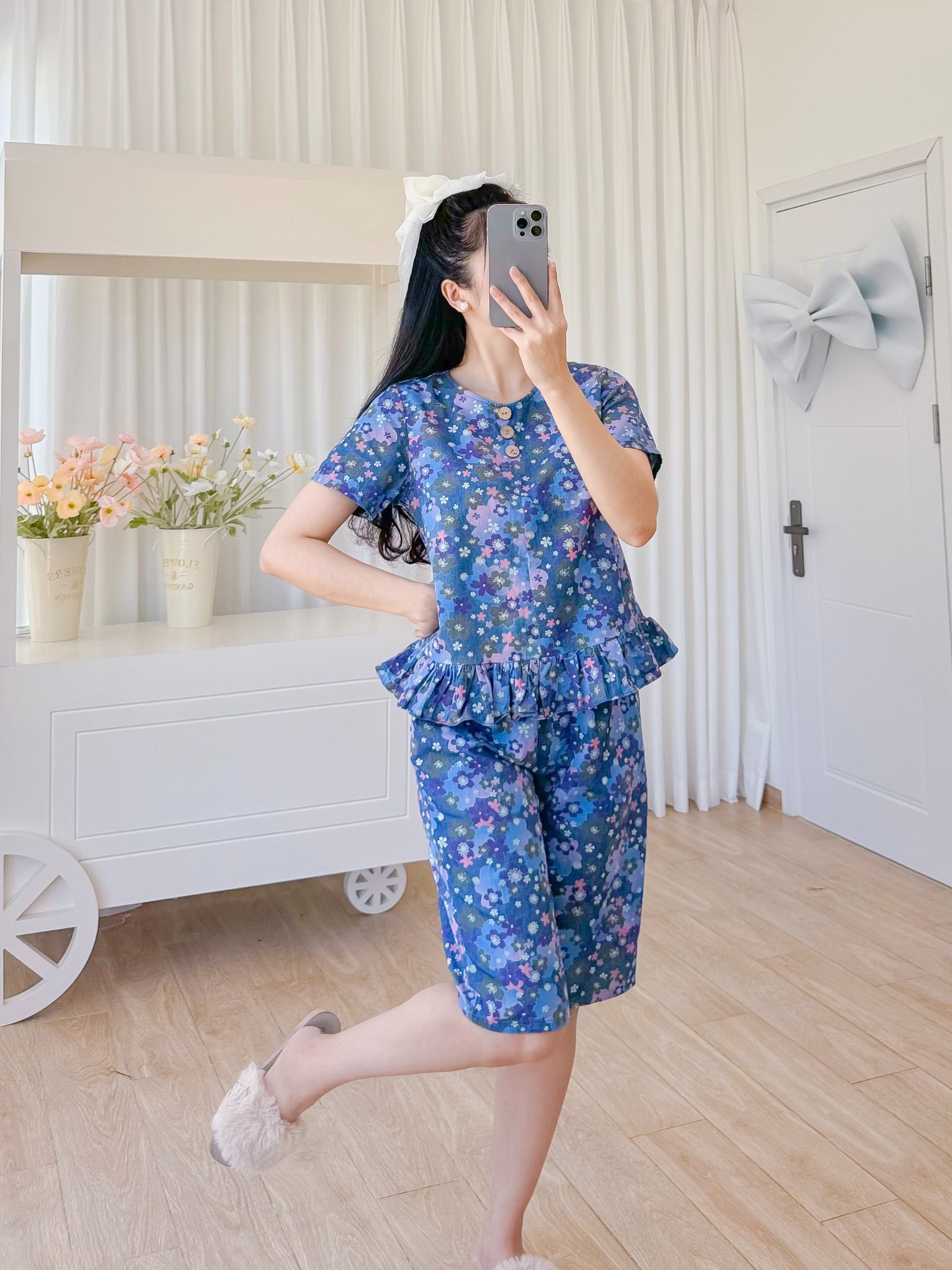 2. Mô tả chi tiết Đồ bộ lửng thiết kế có tay nhún bèo hoa